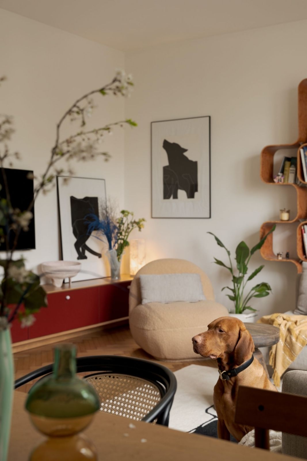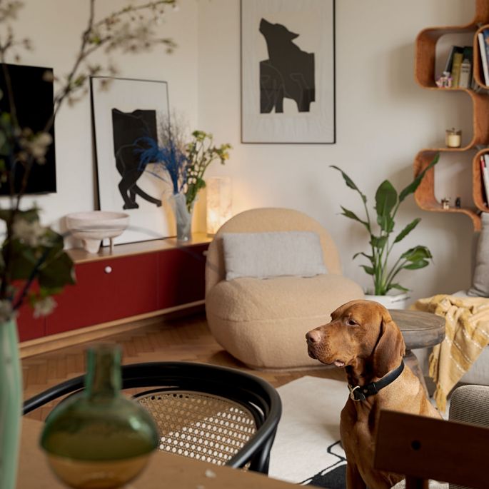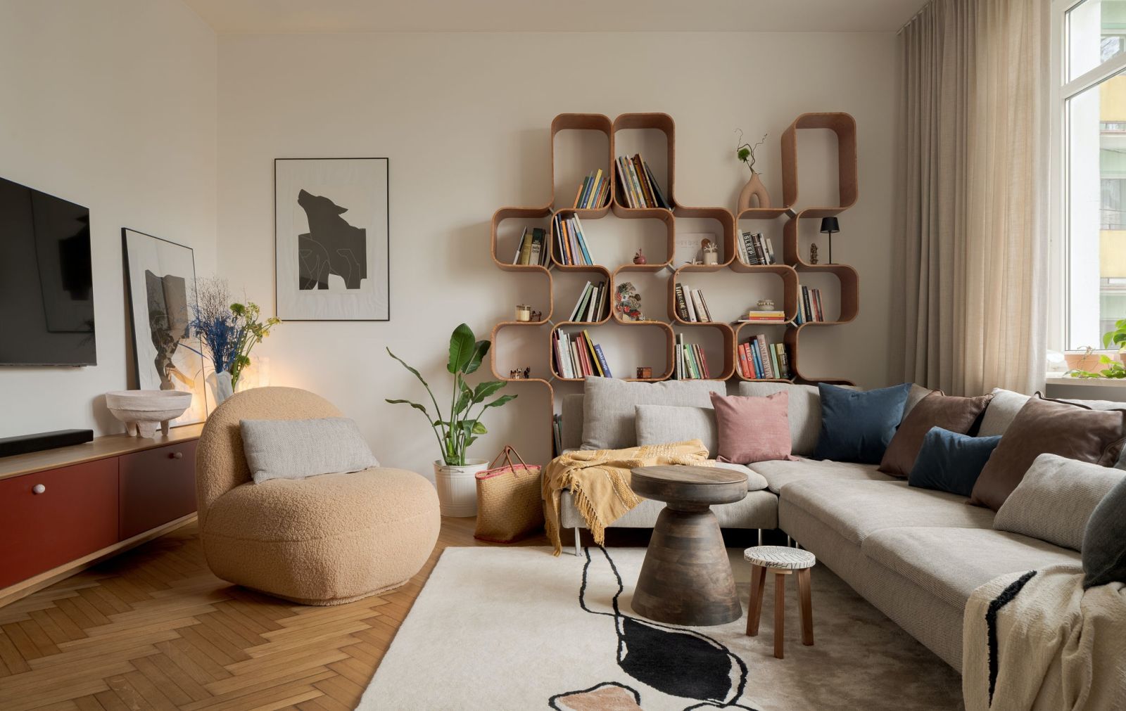 Naprzeciwko, nad niską burgundową komodą, zawisł telewizor. Dwie czarno-białe grafiki (jedna na ścianie, druga o nią oparta) trochę „gubią” czarny kwadrat oraz sprawiają, że mniej dominuje w kąciku wypoczynkowym. Aranżacja została oparta na kontrastach prostych i opływowych kształtów – kanciastą linię sideboardu i kanapy łagodzi regał i fotel obity tkaniną boucle, a miękkości i przytulności dodaje wełniany dywan w abstrakcyjny wzór.