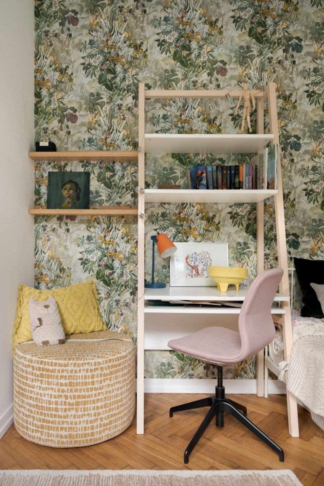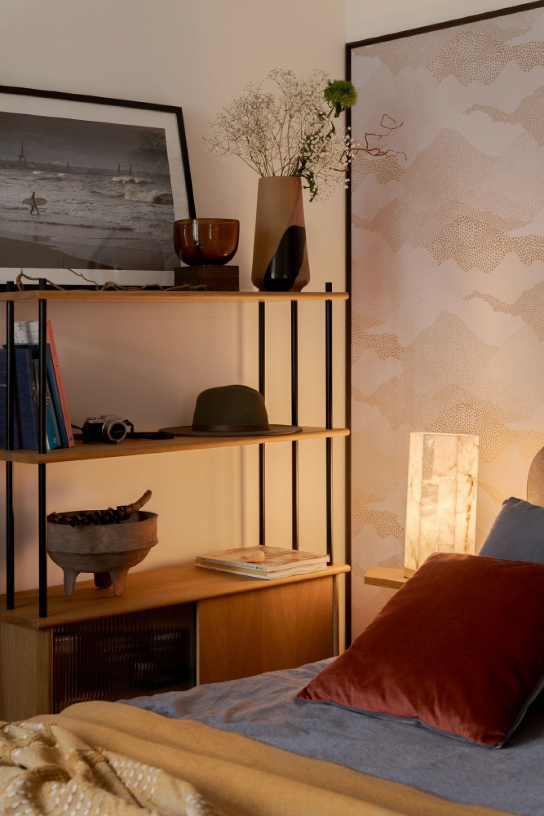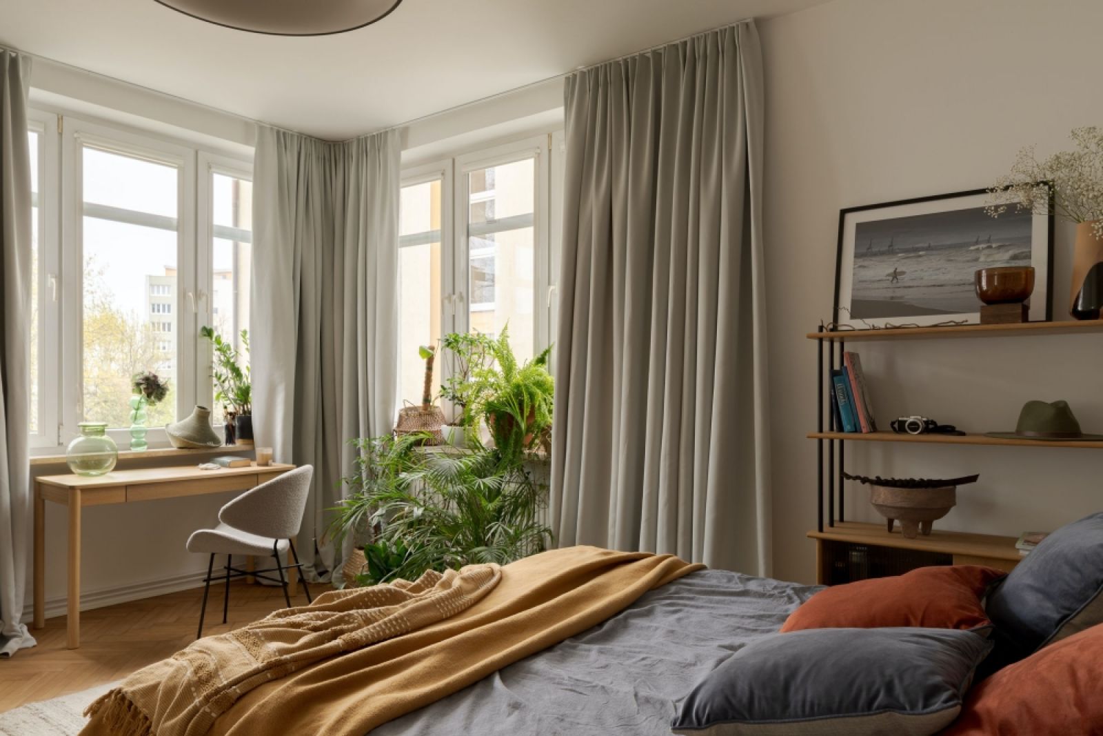 Tutaj od samego początku najważniejsze było narożne okno. Okna tworzą tu tło dla sporej ilości roślin, we wciąż̇ powiększającej się̨ kolekcji. Na ścianie za łóżkiem architektka położyła tapetę z morskimi akcentami oprawioną w cienką ramkę – ten ciekawy pomysł sprawił, że wygląda jak obraz nad tapicerowanym wezgłowiem. Sylwia powiesiła na niej zdjęcia trójmiejskiego fotografa BALTIC Surf oraz grafikę, którą sama kiedyś stworzyła.