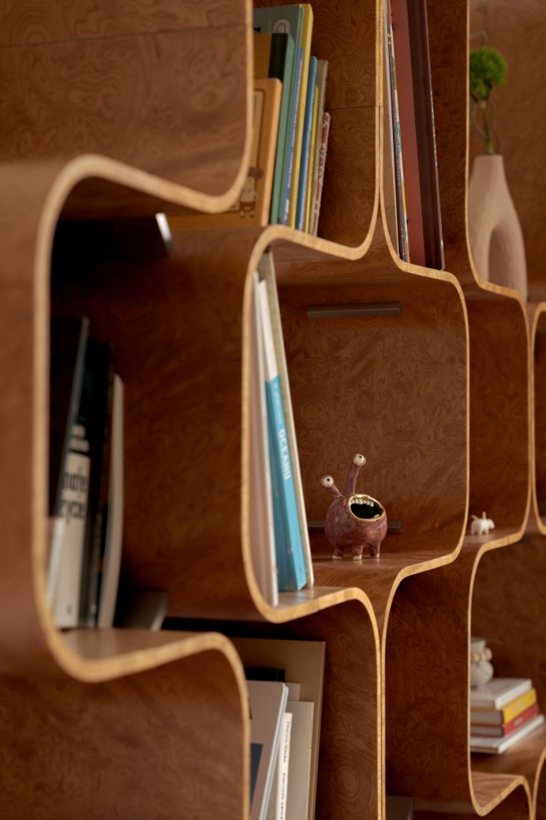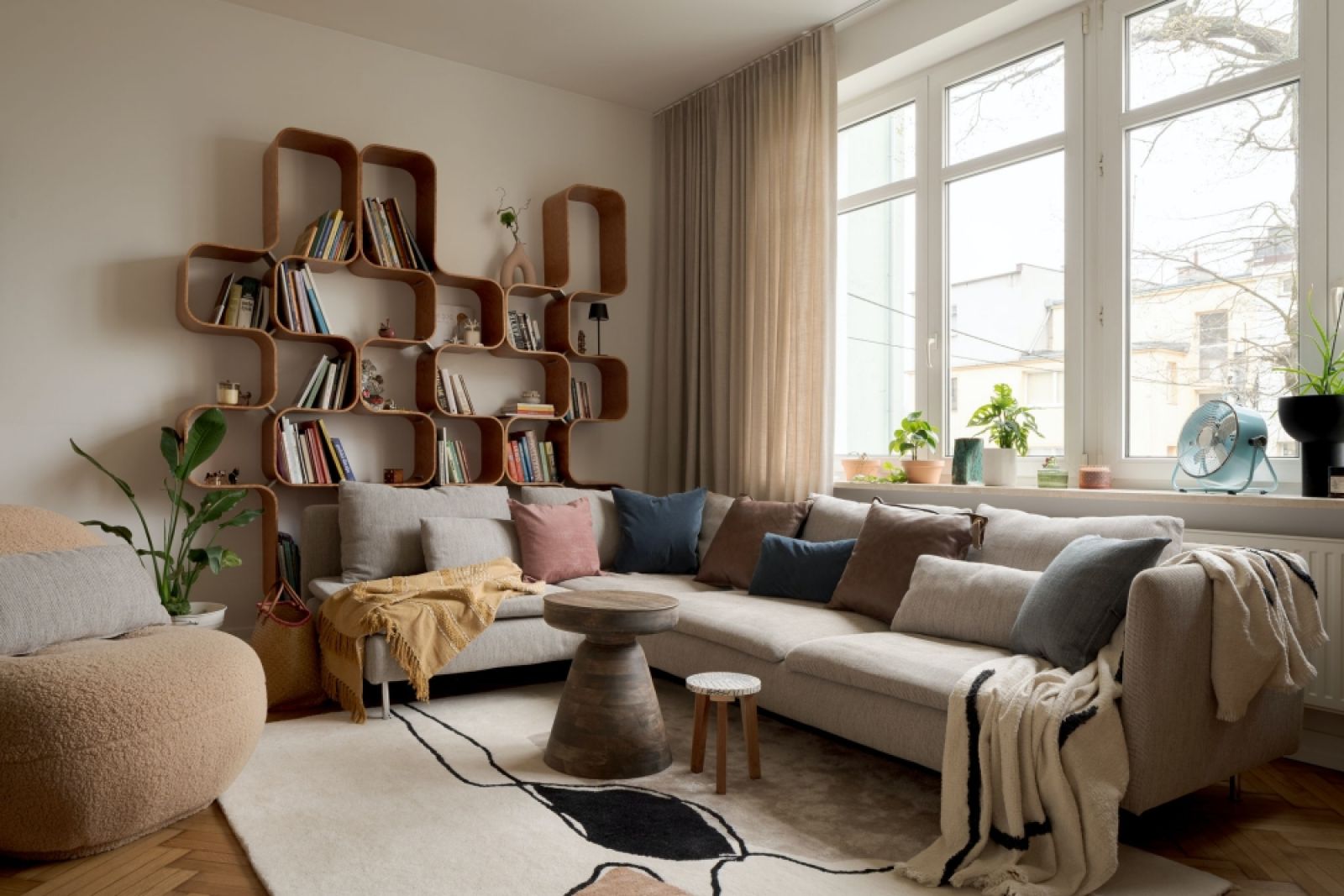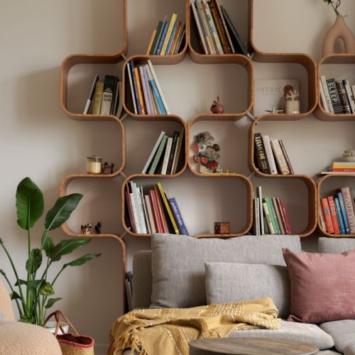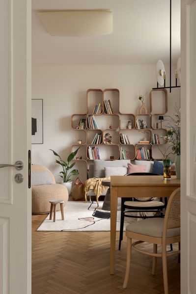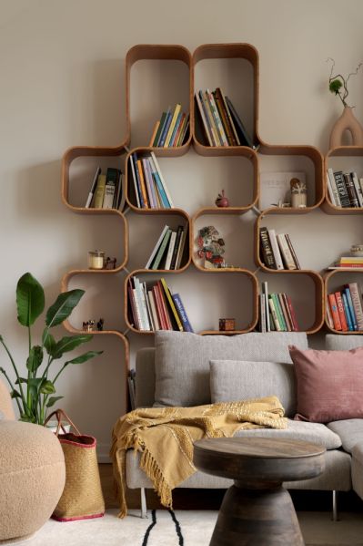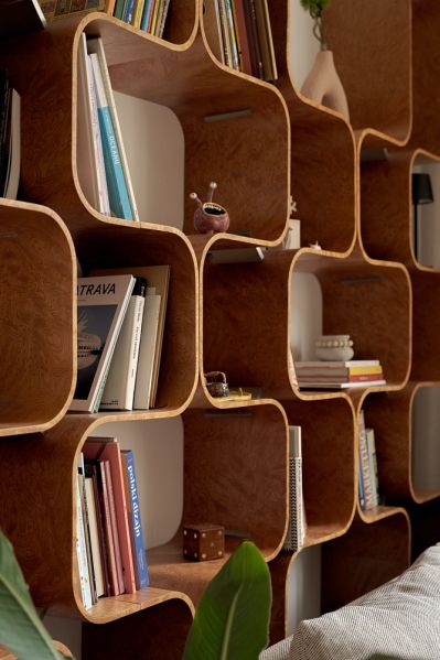 Głównym elementem wystroju salonu jest regał zrobiony z elastycznej sklejki pokrytej fornirem ze wzorem modnej znowu czeczoty.