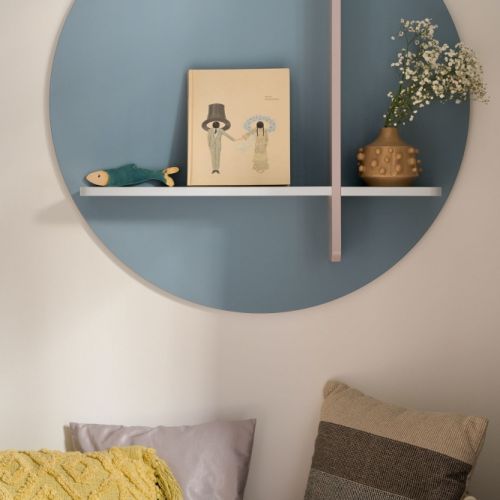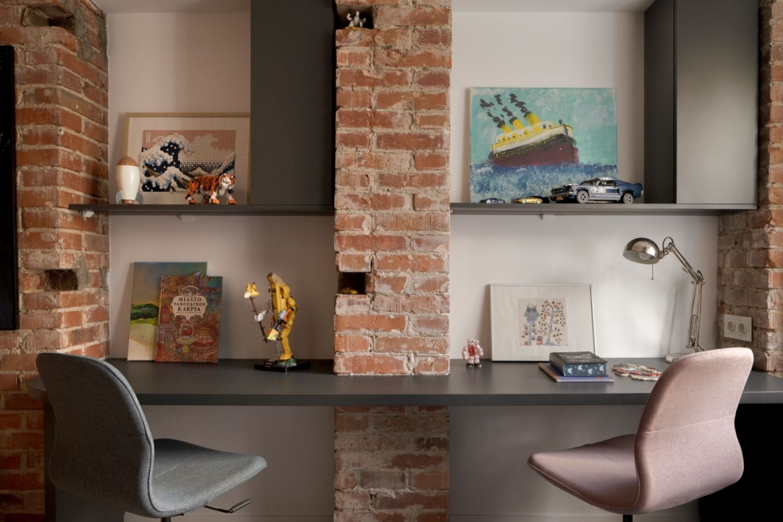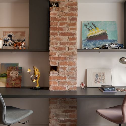 – To mój własny projekt, który powstał jeszcze podczas studiów na ASP w Łodzi – wyjaśnia Sylwia. – Został wykonany ponad 15 lat temu, ale dopiero teraz zyskał właściwą przestrzeń. Rzeczywiście jest bardzo efektowny i można powiedzieć, że „robi” całe wnętrze. Półki o opływowym kształcie wiją się po ścianie niczym wstęga tworząc łagodną konstrukcję – trochę nowoczesną, trochę vintage.