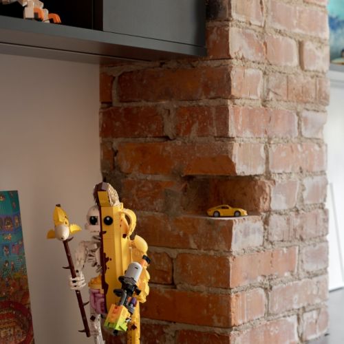 O tym, że jesteśmy w starej kamienicy świadczy chociażby amfiladowy układ pokoi, charakterystyczny dla przedwojennego budownictwa. W największym rzecz jasna urządzony został salon. Tu znajduje się kominek, który został przerobiony ze starego pieca. Podczas częściowej rozbiórki udało się ocalić szkliwione kafle w kolorze butelkowej zieleni i ozdobne kute drzwiczki – teraz pięknie zdobią białą bryłę.