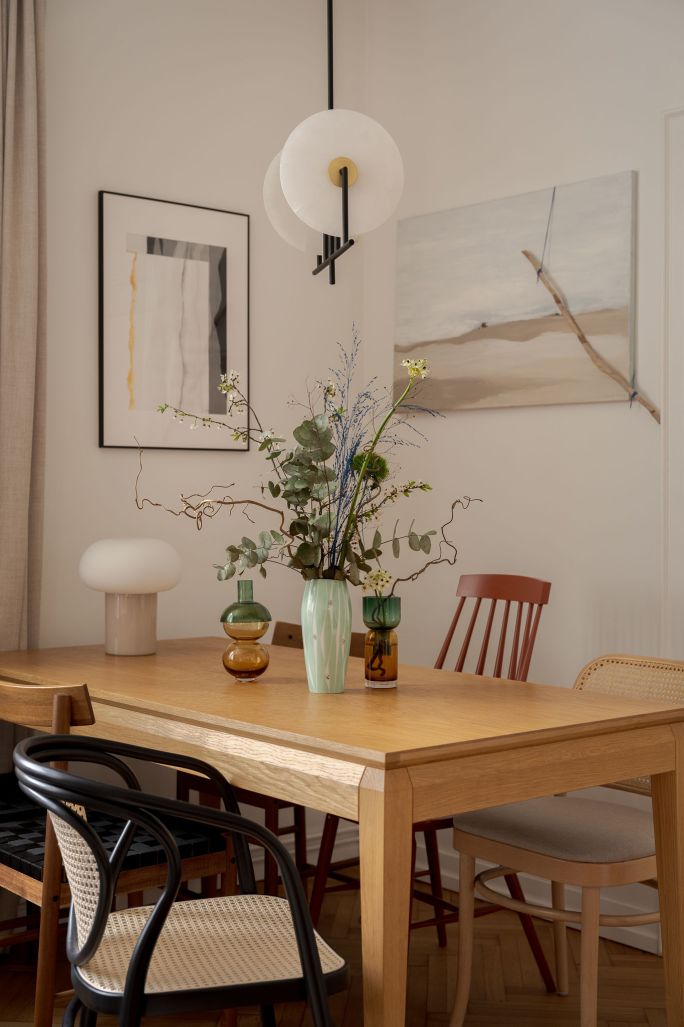 To wokół kominka skupia się aranżacja jadalni. W pobliżu paleniska, w którym w chłodniejsze dni rozbłyska ogień, został ustawiony stół – duży, z litego drewna. Z powodzeniem mieści się przy nim cała rodzina, a kiedy jest potrzeba można go powiększyć prawie o drugie tyle. Sylwia ustawiła przy nim krzesła polskiej marki z długoletnią historią – nowoczesne, ale nawiązujące do minionych czasów. A więc są i gięte wzorowane na dawnych meblach Thoneta, wyplatane wiedeńską plecionką i słynny „patyczak” w czerwonym kolorze oraz drewniane z jutowymi pasami inspirowane latami 60. Taka eklektyczna różnorodność modeli bardzo ciekawie wygląda i wprowadza niezobowiązującą atmosferę.