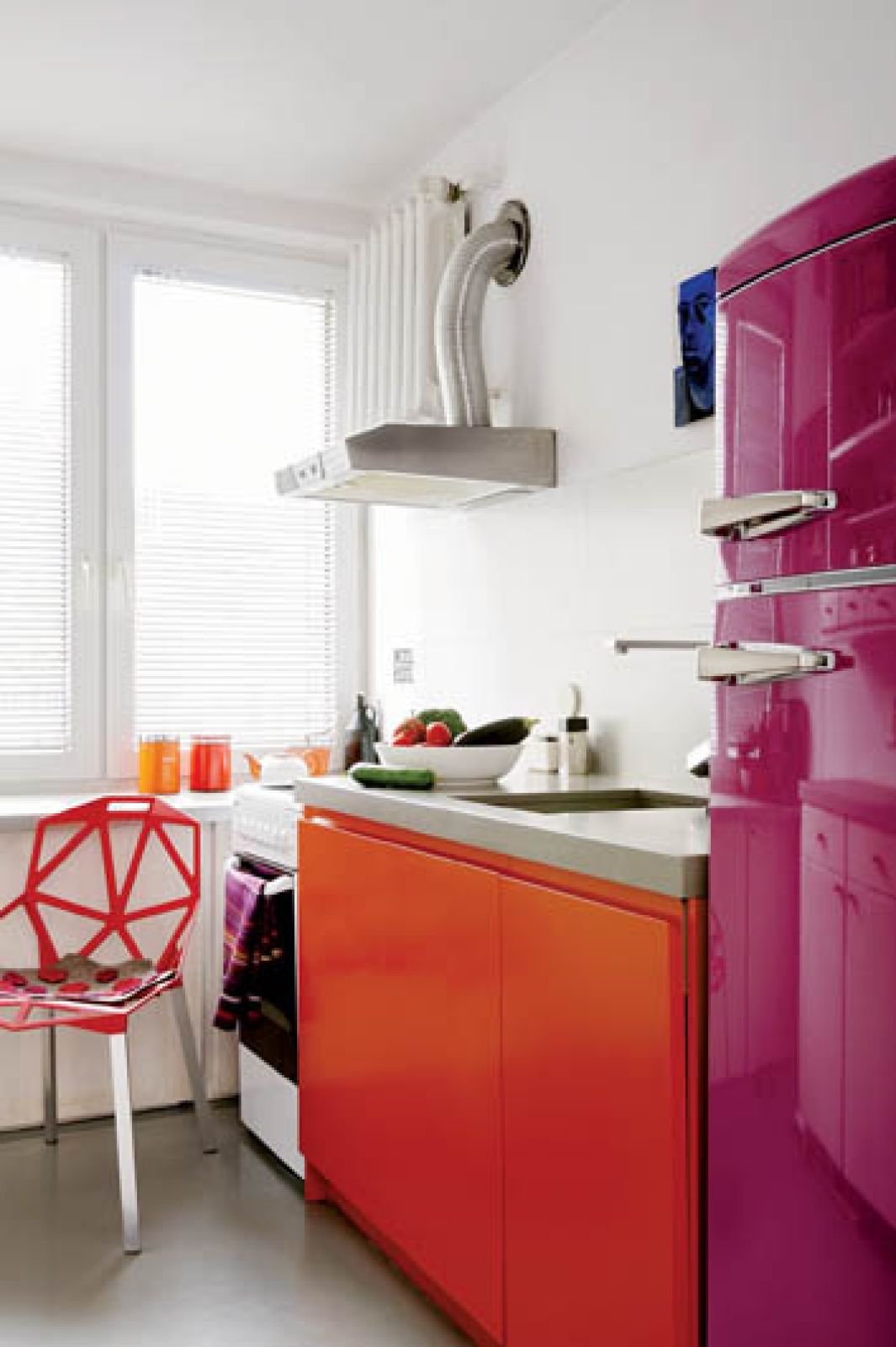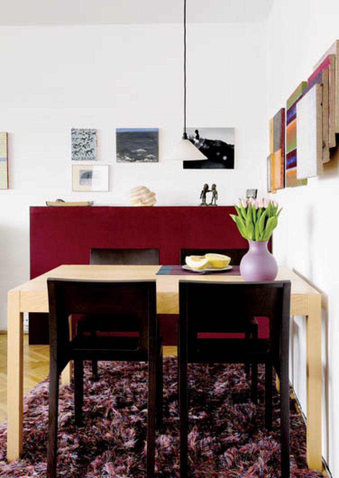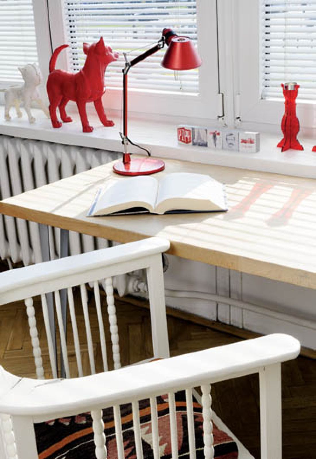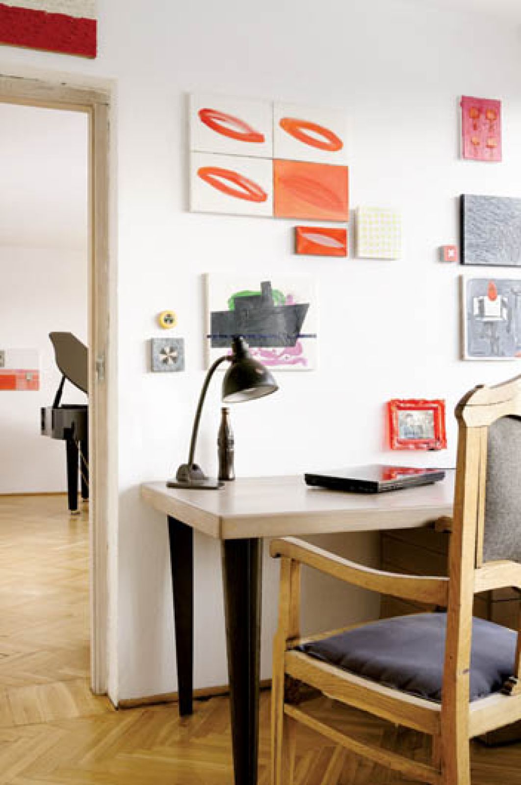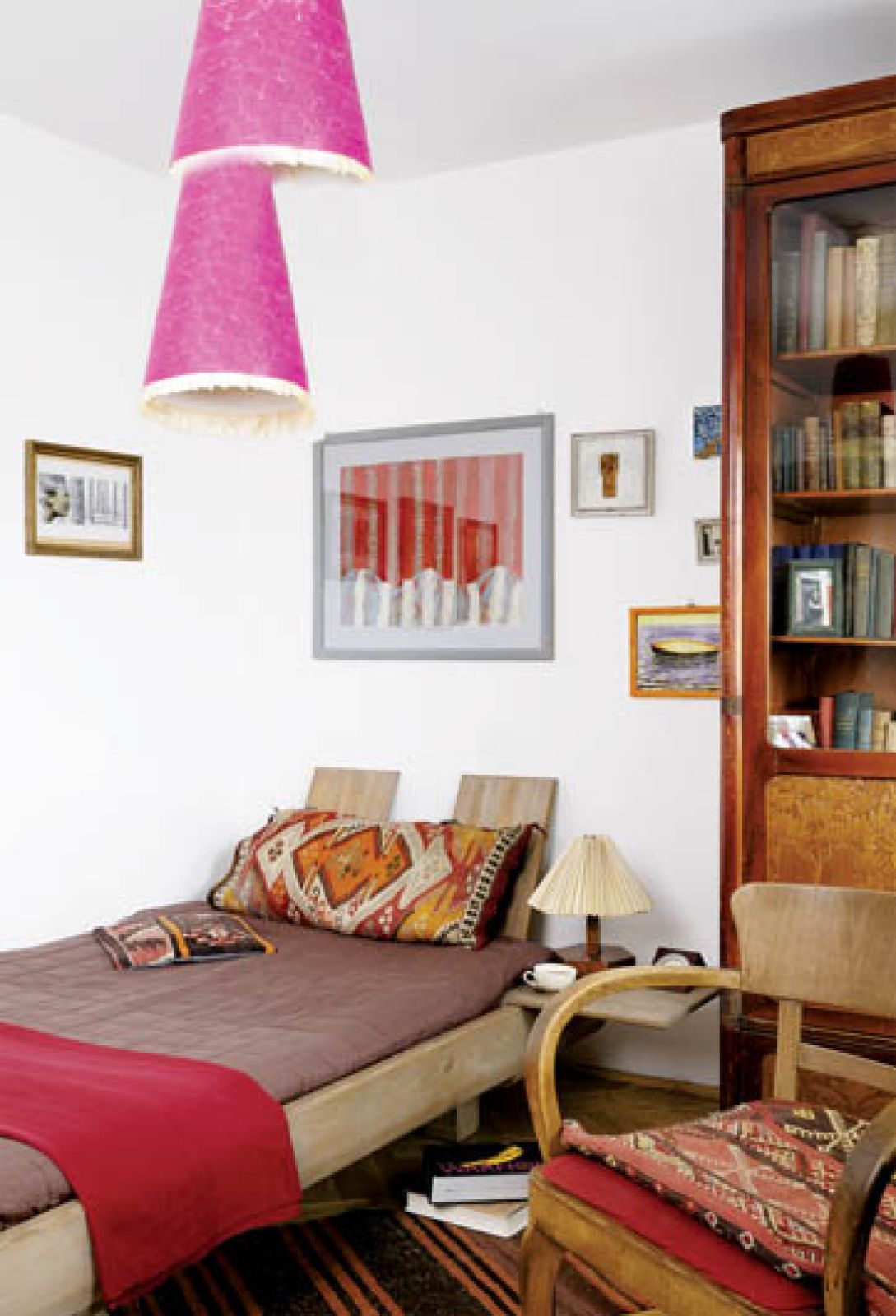 – Kiedyś namiętnie przerabiałam meble z targu na Kole. Teraz mi przeszło, ale nadal bawię się w tapicera – śmieje się Elżbieta. – Jednak zamiast tkanin obiciowych wykorzystuję najchętniej T-shirty za grosze. Moim patentem są barwne ekrany maskujące regał na książki: spadochronowe płótno, naciągnięte na blejtramy i przy- czepione rzepami do półek.