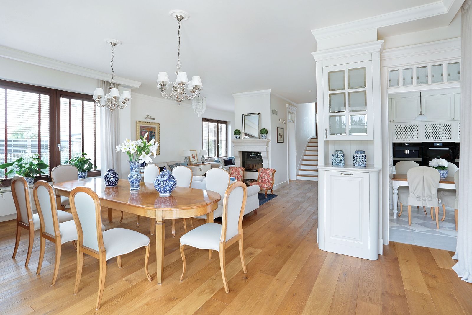 Choć nowy dom bardzo im się podobał, i tak wyburzyli lub przesunęli większość ścian. – Na dawnym miejscu został tylko kominek – mówią. W salonie dorzucili ogromne okno, dobudowali też taras, żeby można było jeść obiady wśród zieleni. Teraz dom ma trzy serca: kuchnię, kominek i taras. Wszystko zaprojektował i nadzorował architekt Roland Stańczyk. On wymyślił rozsuwane drzwi z piaskowanymi szybami, dobrał szczotkowane podłogi, jeździł do Mediolanu, żeby przyjrzeć się portugalskiej firmie AM Classic, w której zamówili kredens, komody, krzesła i stół na 16 osób. – Mają doskonałe forniry, świetnie patynują meble, a przy tym klasyka w ich wydaniu jest nowoczesna – mówi. Zaprojektował także meble do kuchni. Wyzwaniem okazało się upchnięcie „mienia przesiedleńczego”. – Pan Roland to mistrz od ukrywania szaf – śmieje się właścicielka. – Jest ich tu mnóstwo, ale pozostają niewidoczne.