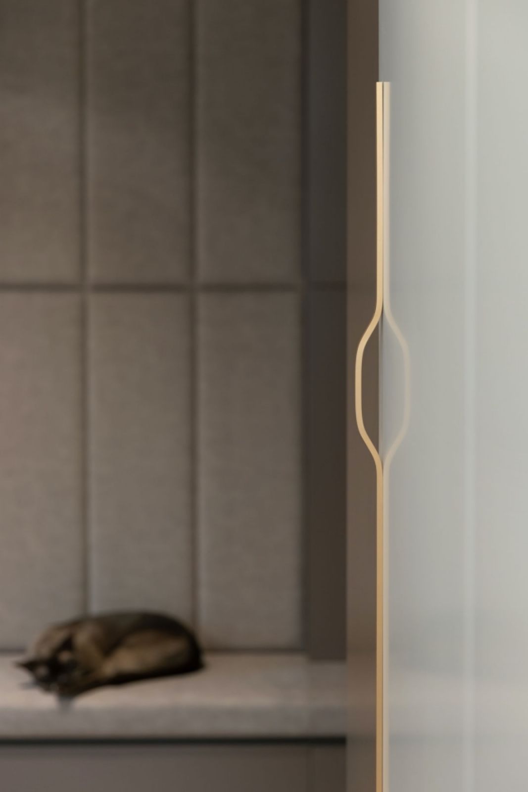 – Sypialnia powinna być oazą wyciszenia. Wykładzina z długim włosem znakomicie wygłusza pokój, a żeby wzmocnić ten efekt, dodatkowo drzwi pokryliśmy od wewnątrz akustyczną tapetą – opowiada projektantka. – Centralnym meblem jest oczywiście duże, tapicerowane, kontynentalne łóżko – wyjaśnia. – W każdym pomieszczeniu starałam się wpleść „biżuteryjny”, odbijający światło motyw mosiądzu albo złota – w postaci armatury, detalu czy drobnych elementów meblowych, jak na przykład uchwyty. Z tą samą intencją grałam też lustrami – nie tylko w sypialni – uzupełnia Tatewik Caturowa.