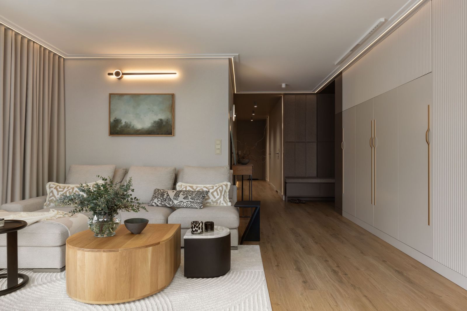 Piaskowe beże i szarości we wnętrzu – ocieplono je drewnem i miękkimi tkaninami