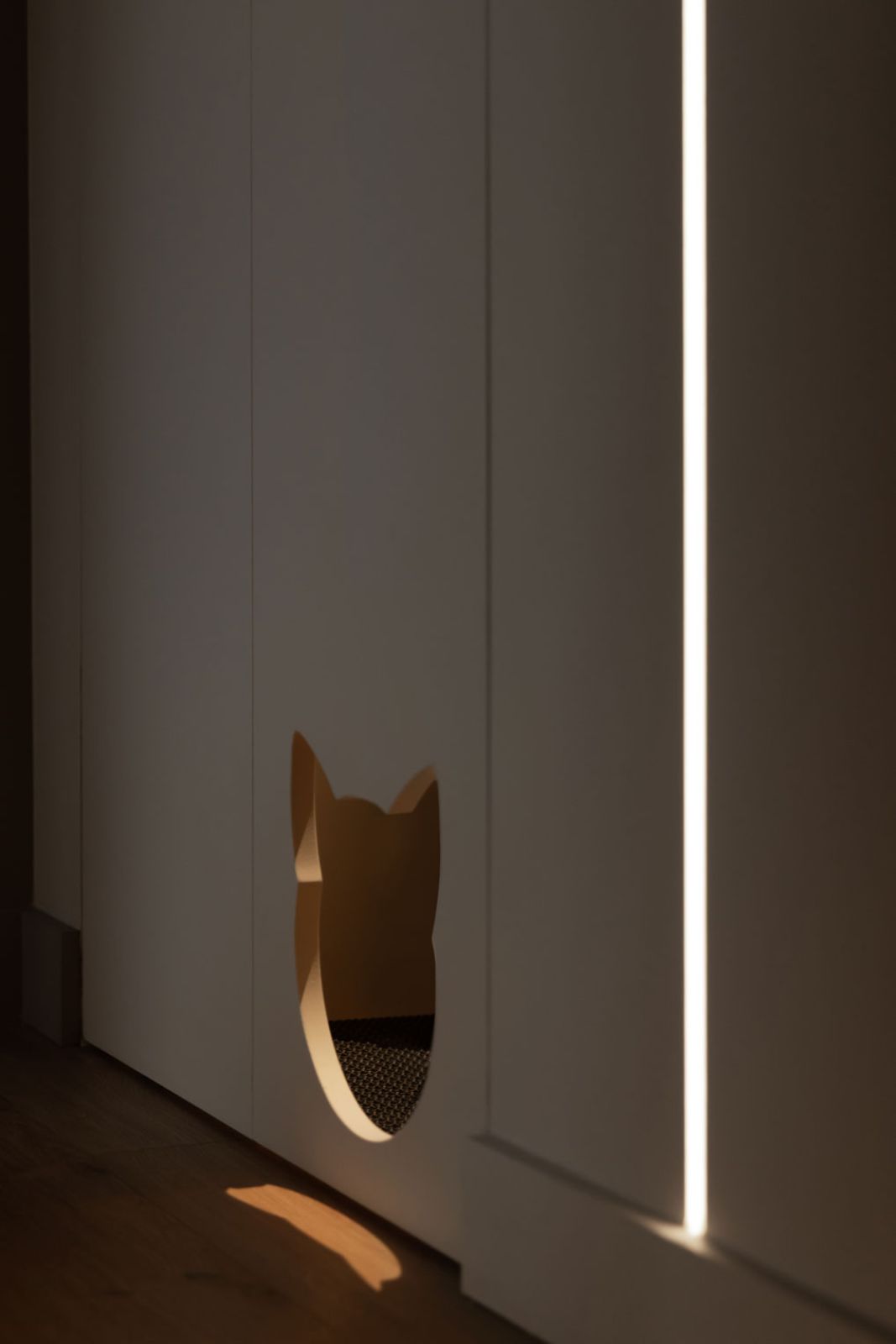 Na uwagę w całym apartamencie, nie tylko w holu, zasługują rozwiązania oświetlenia, takie jak paski LED z czujnikiem ruchu schowane w listwach przypodłogowych, szczeliny świetlne w zabudowach meblowych czy podświetlane lustra. – Jeśli mieszkanie ma być przytulne, to światło musi zaistnieć we wszystkich trzech strefach: przy podłodze, na ścianach i w obrębie sufitu, z możliwością dowolnego nim sterowania, bo tak tworzy się nastrój – przekonuje projektantka.
