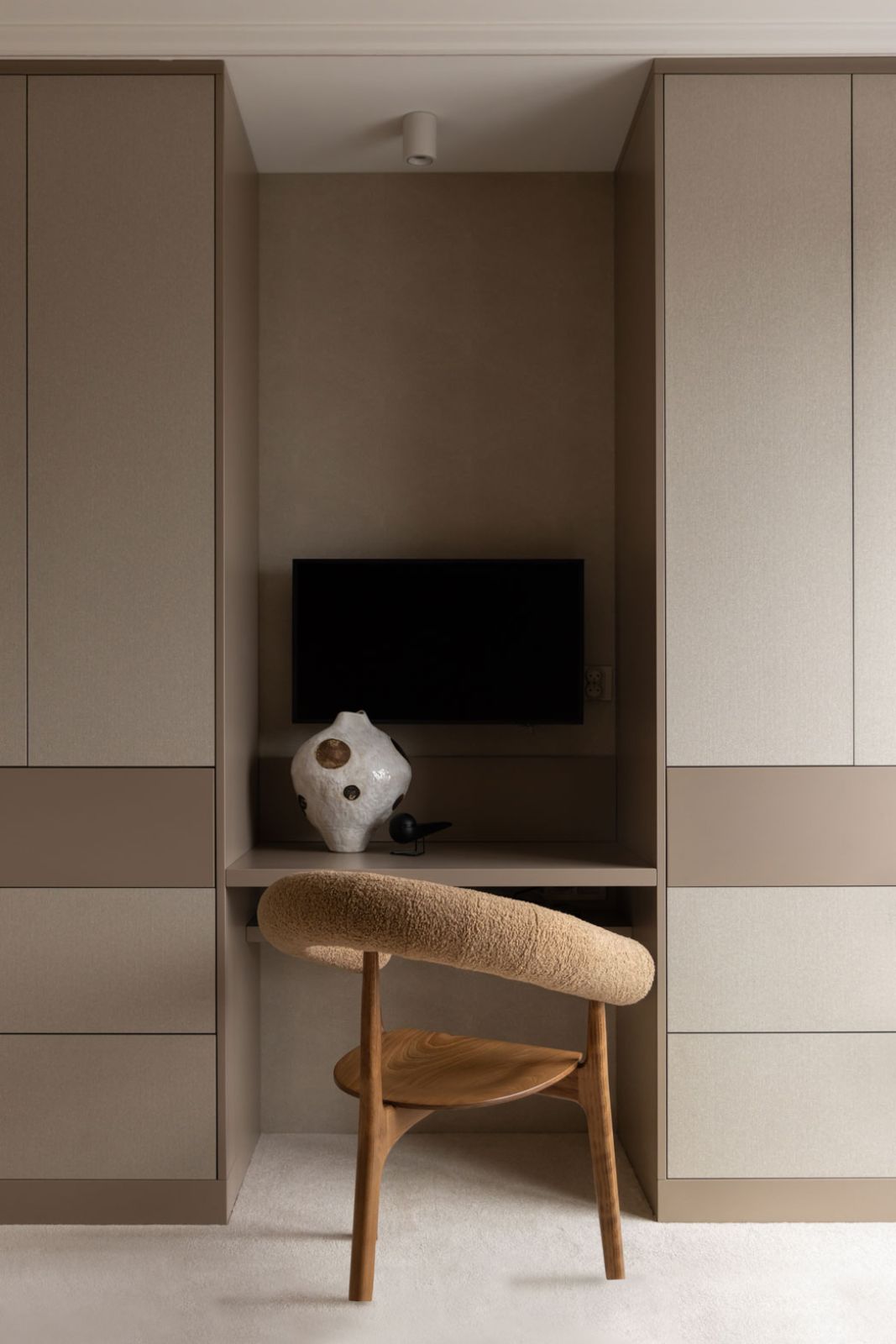 Fronty szaf pokryte zostały imitacją tkanin z klasycznymi motywami chevron oraz jodełki, a drzwi wykończone pluszową, tekstylną tapetą. Ścianę za łóżkiem z kolei pokrywają w całości tapicerowane panele sięgające aż do sufitu. Połyskują między nimi wąskie, pionowe tafle brązowych luster. Puszysta wykładzina na podłodze ma dodatkową warstwę i jest tak miękka, że rano stawiając na niej stopy właściciele mają wrażenie jakby stąpali do lekkiej puszystej chmurce.