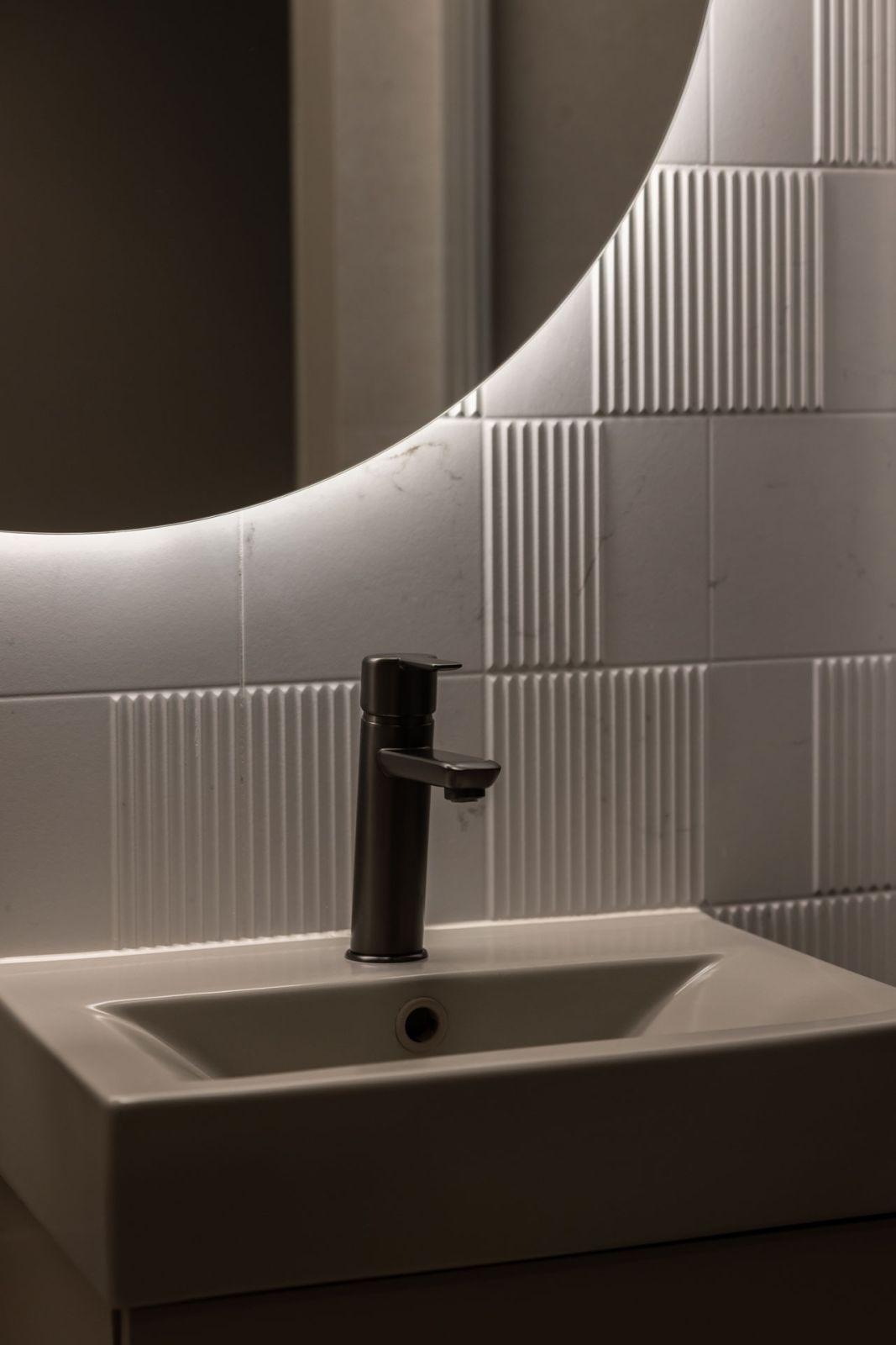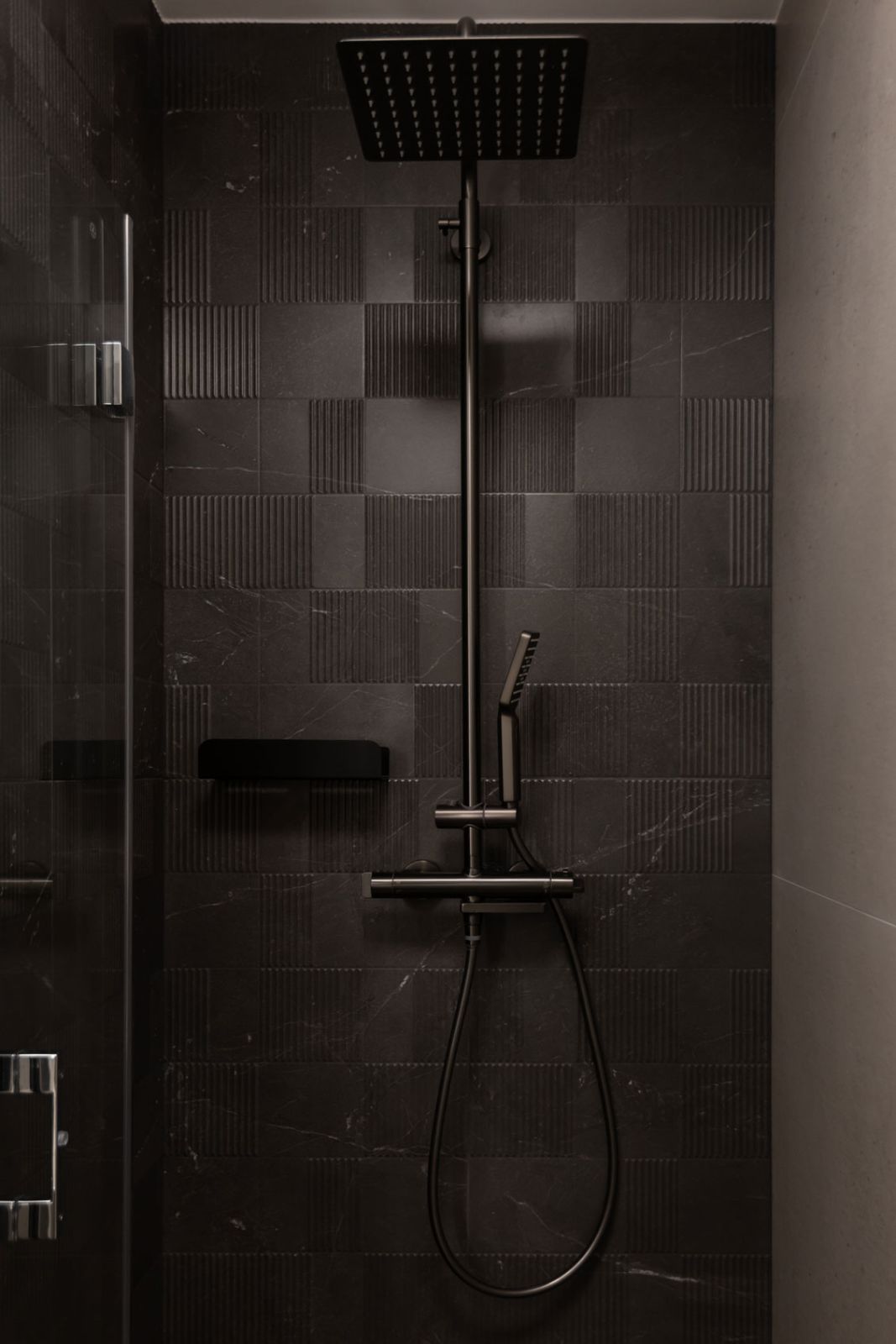 Projekt Tatewik Caturowej to przykład perfekcyjnie dopracowanej ergonomii wnętrza. Wszystkie meble stałe zostały zaprojektowane na miarę potrzeb, z dbałością o najdrobniejsze detale: od szaf na ręczniki wyposażonych w otwory wentylacyjne i umiejscowionych obok grzejnika w łazience, po lustro z wbudowanym modułem bluetooth, emitujące równocześnie światło (z możliwością zmiany jego temperatury barwowej) i muzykę. Armatura łazienkowa została dobrana pod kątem zarówno designu, jak i funkcjonalności.