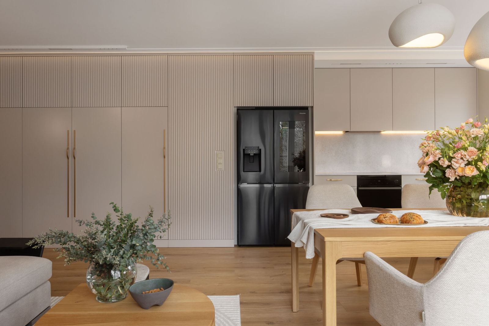Mieszkanie w naturalnej palecie odcieni taupe – total look w luksusowym nadmorskim apartamencie