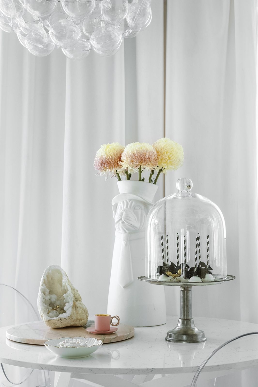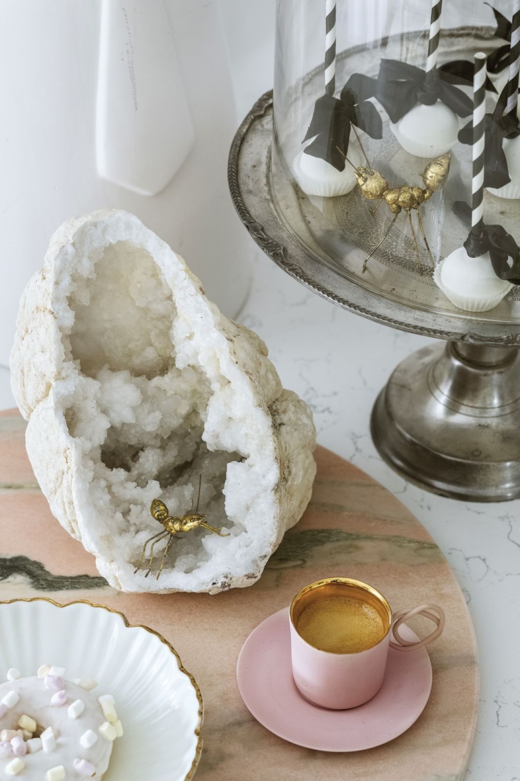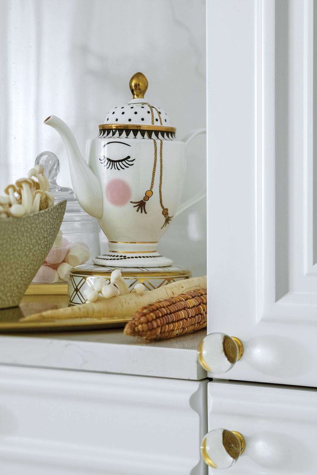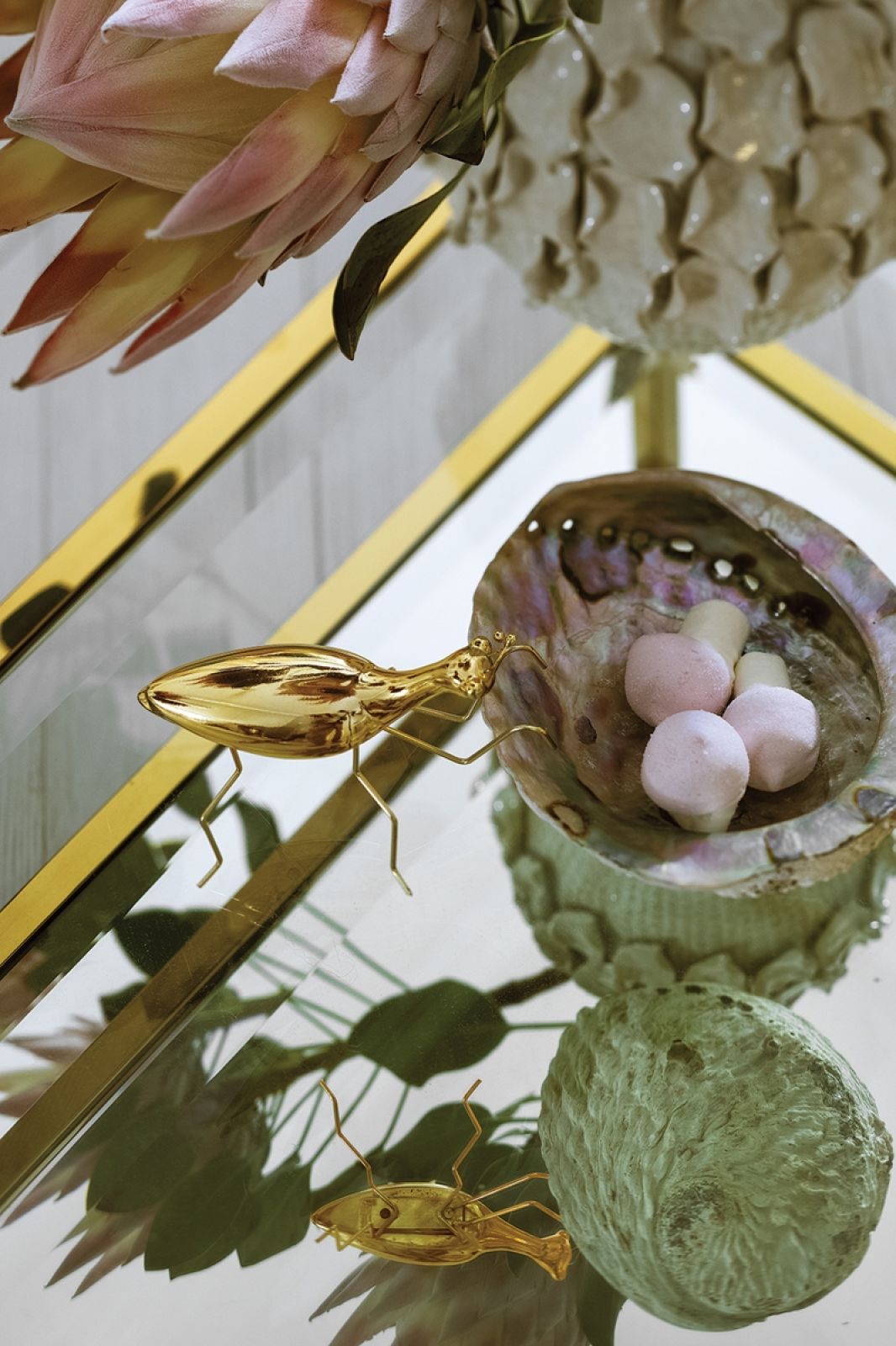 W jasnej eleganckiej przestrzeni, gdzie klasyka miesza się z elementami stylu glamour, intrygującą ozdobą są figurki zwierząt. Najwięcej jest lampek w kształcie małp, jest pies w salonie i wielka żaba w kabinie prysznicowej. Do tego mnóstwo złotych owadów rozsianych po całym domu. Zaglądają do miseczek, wędrują po regałach, połyskują elegancko. Nadają wnętrzu wesoły, artystyczny klimat.