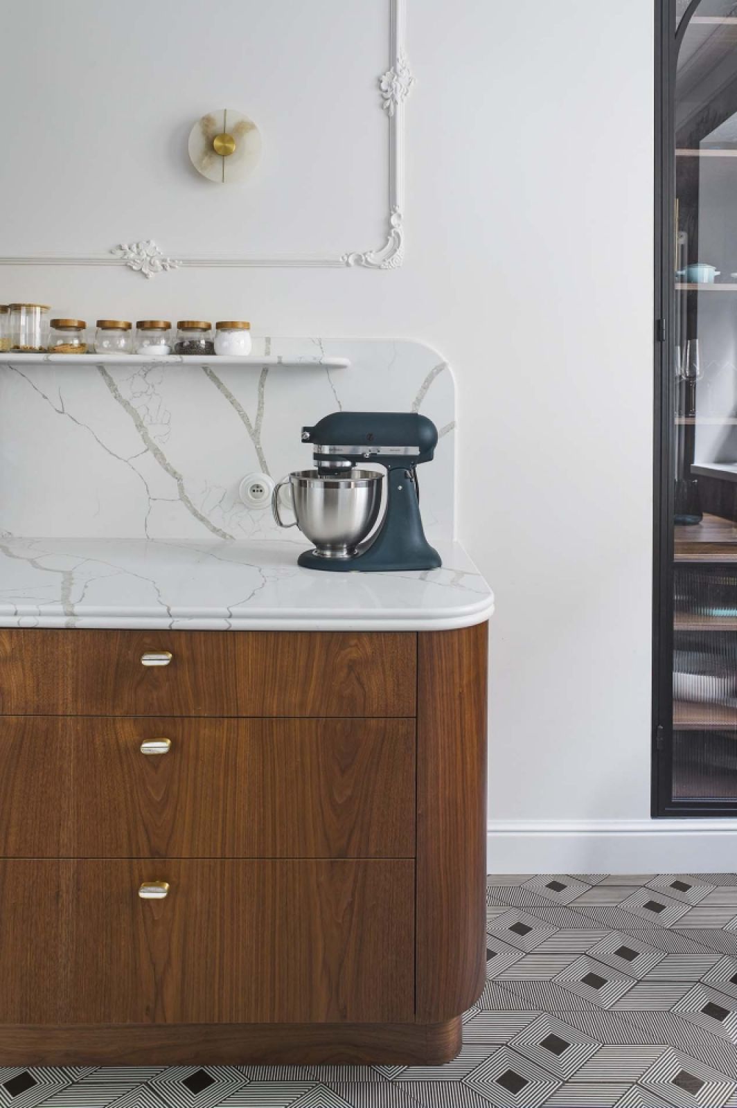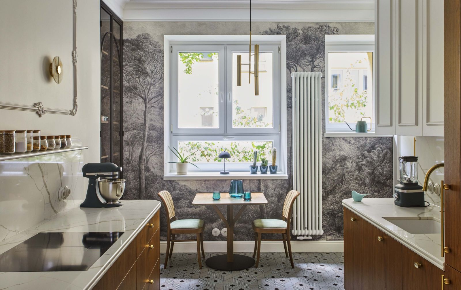 Kuchnia z forniru orzechowego i meble na zamówienie w mieszkaniu w kamienicy