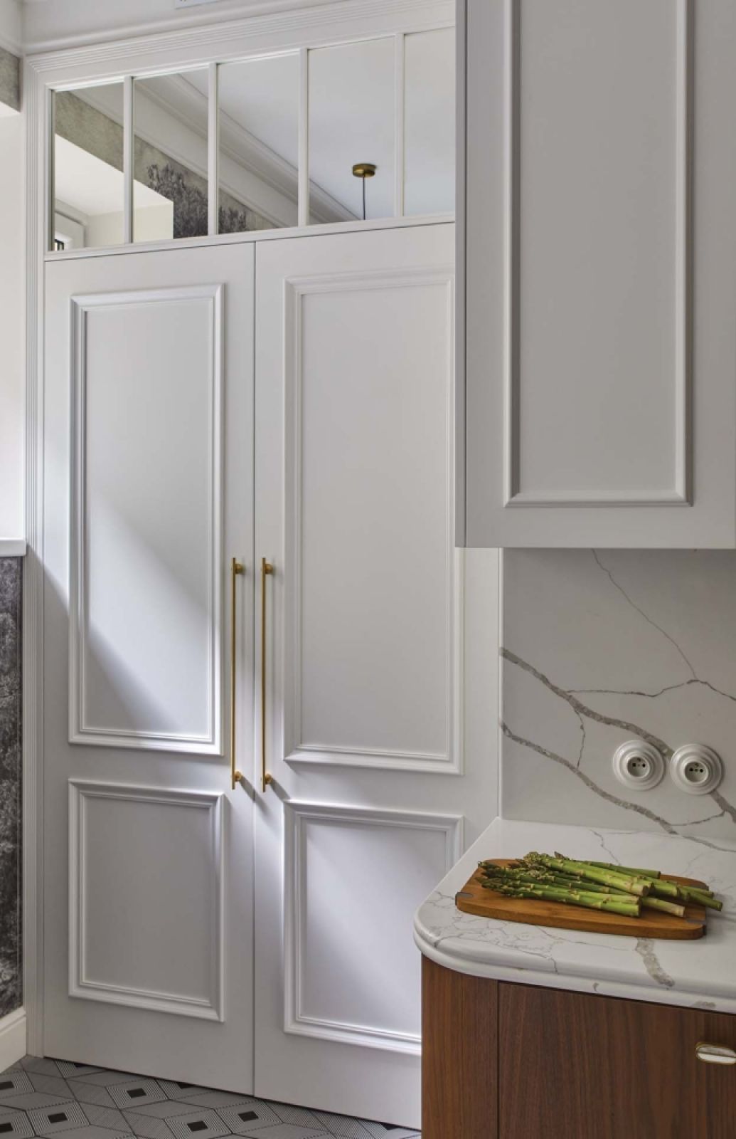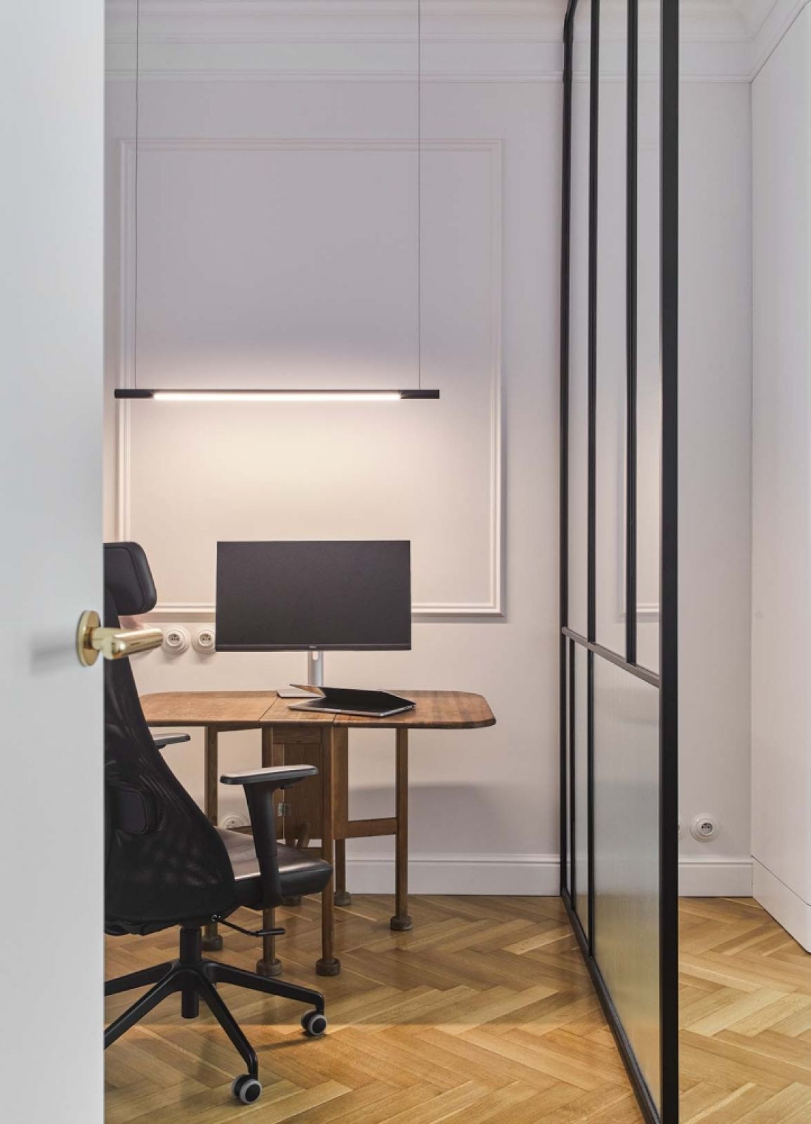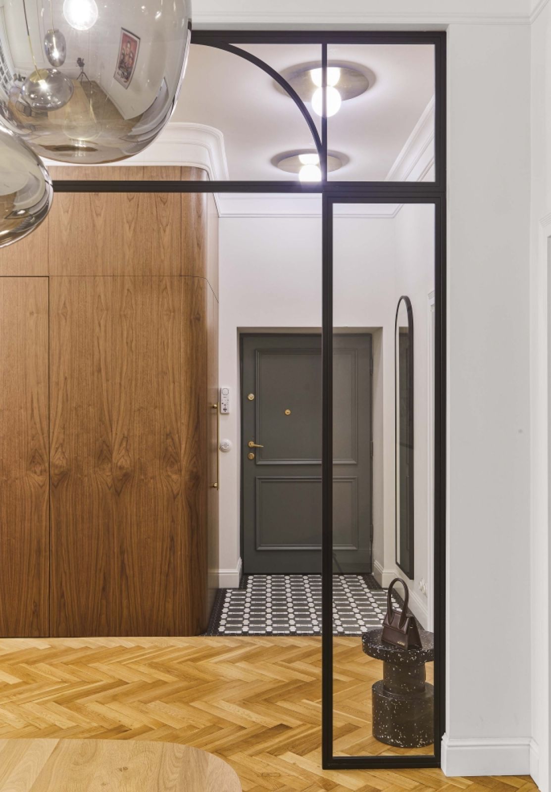 Tylko podłoga nie została rozjaśniona, bo nie można poprawiać ideału – pod starą wykładziną zachowała się bowiem przedwojenna klepka z dębu, ułożona w klasyczną jodełkę. Została tylko pięknie odrestaurowana.