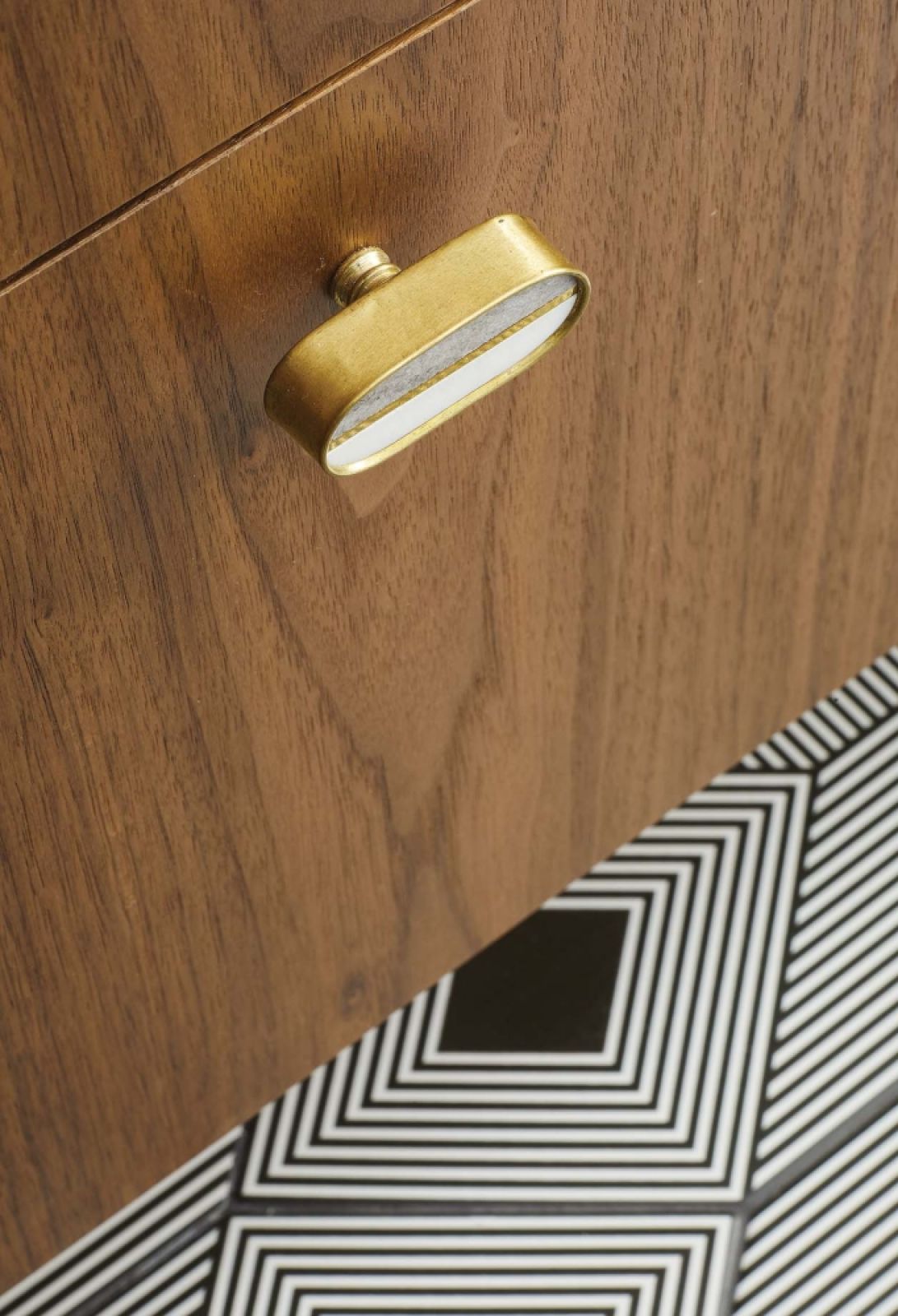 Cała zabudowa kuchenna, włącznie z zaobloną konstrukcją w holu (w niej projektantki sprytnie ukryły małą toaletę), fornirowana orzechem amerykańskim została zrobiona na zamówienie. Wymagała mozolnej pracy nad detalami, bo aby nowe meble dopasować do starego budownictwa, trzeba je było po prostu „rzeźbić", przerabiać i dostosowywać do różnych drobnych krzywizn.