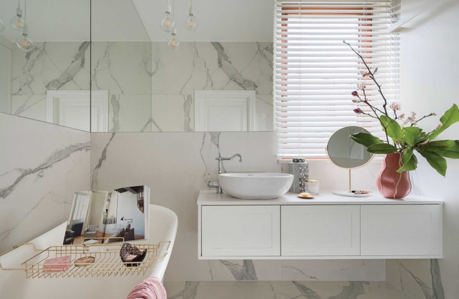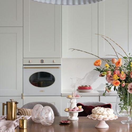 Motyw marmuru (to właściwie spiek ceramiczny) powtarza się w kuchni i łazience. Pojawia się na stoliku kawowym w salonie i konsolce w korytarzu. Zmieniają się tylko kolorowe dodatki, kwiaty i tekstylia, ale to wystarcza, by zupełnie odmienić wnętrze i nadać mu nowy charakter. Zgodnie ze swoim humorem można po prostu poszaleć, i to niewielkim kosztem!