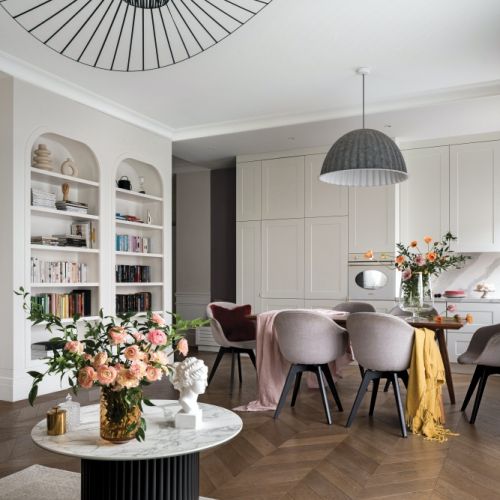Mieszkanie ma część dzienną i prywatną. Ta pierwsza to duży salon z otwartą kuchnią i wyjściem na ogród. Korytarz oddziela tę część od głównej sypialni, dwóch pokoi dla dzieci i pomieszczenia gospodarczego. Są także dwie łazienki. A wszystko to w stylu… paryskiej kamienicy. – Nowoczesność przełamana starym klimatem to mój sposób na wnętrze – opowiada Izabela. – Lubię sztukaterie i drewno, podobają mi się nieoczywiste połączenia i kontrasty we wnętrzach. Gdy więc zobaczyła, że mieszkanie, mimo iż nowo zbudowane, ma trzy metry wysokości, od razu pomyślała o wnętrzach kojarzących się z kamienicą. A że było w stanie deweloperskim, mogła wszystko wymyślić od podstaw.