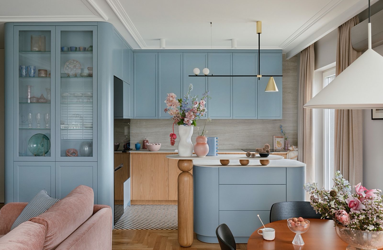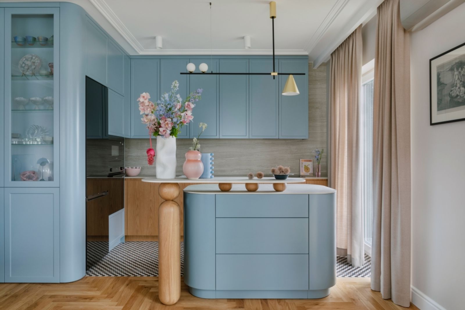 Błękit, pudrowy róż i modne obłości. To mieszkanie w pastelowych kolorach zaprojektowała pracownia Hanny Pietras