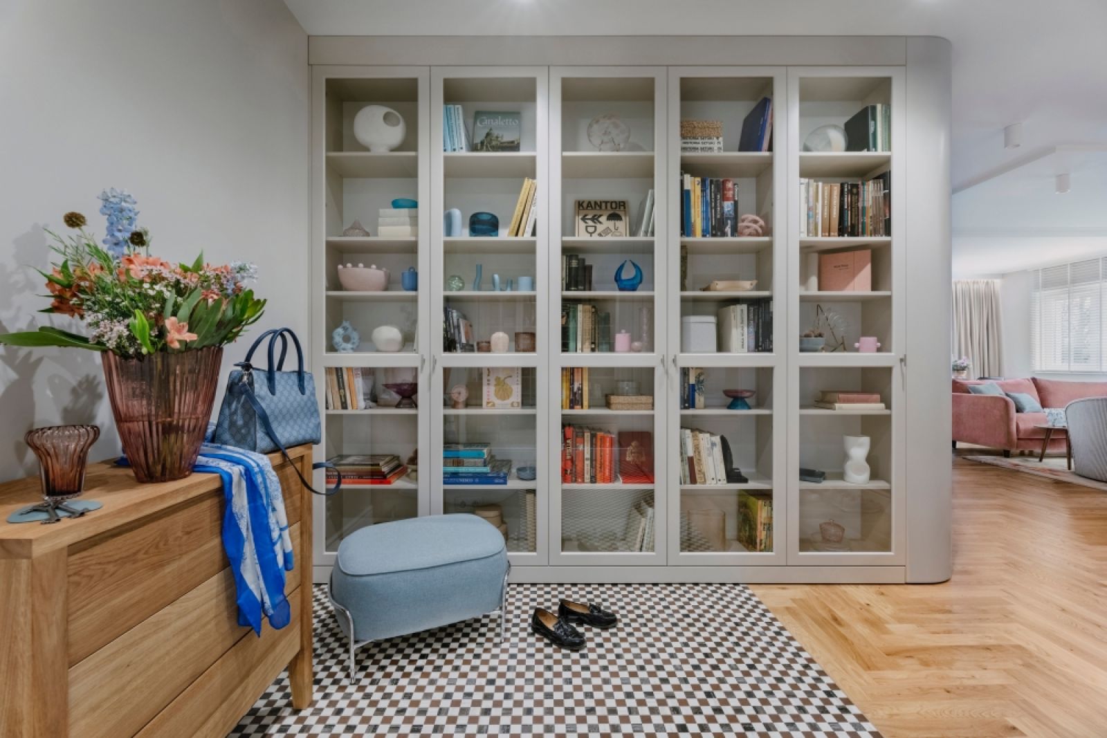 – Dla naszej klientki kluczowa była przestrzeń. Przeprowadziła się z dużego domu i zależało jej, żeby w mieszkaniu nie odczuwała aż tak dużej różnicy – mówi Hanna Pietras. – Kolejna potrzeba, która została dosyć precyzyjnie określona to przestrzeń do pracy, ale ukryta. Miejsce musiało być zamknięte, bo pojawia się w nim dużo prywatnych akcentów. Tutaj zaproponowaliśmy drzwi przesuwno-otwierane, dzięki temu w każdym momencie jednym ruchem ręki można je zasłonić – dodaje architektka.