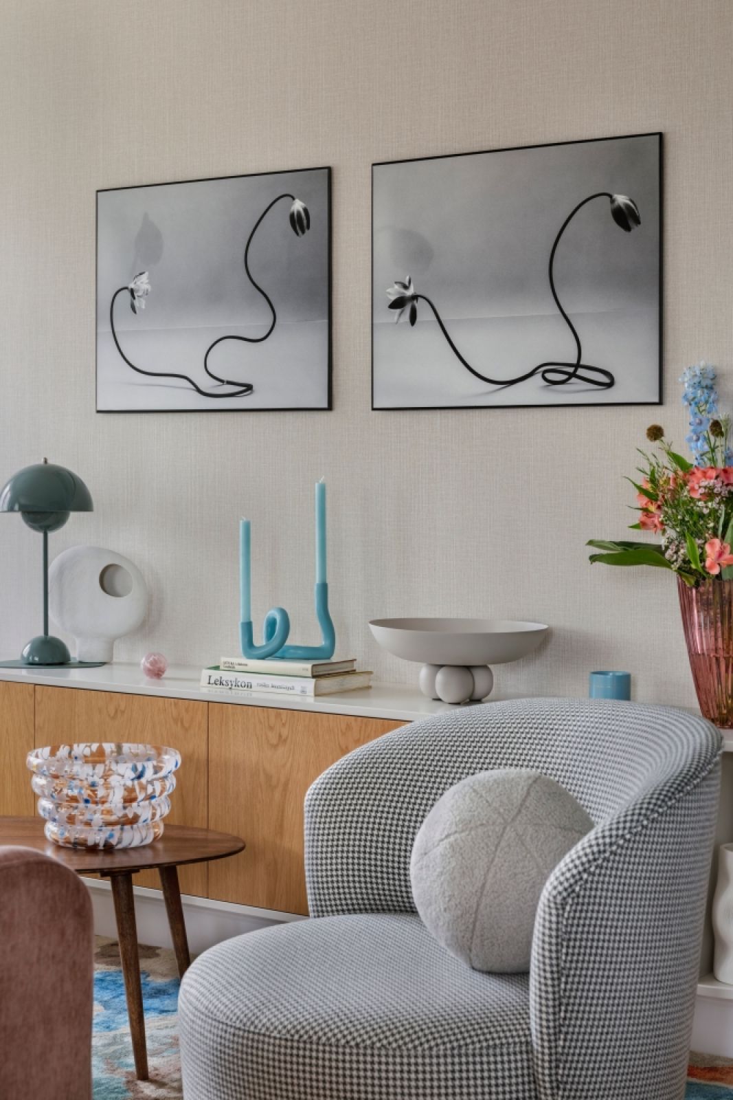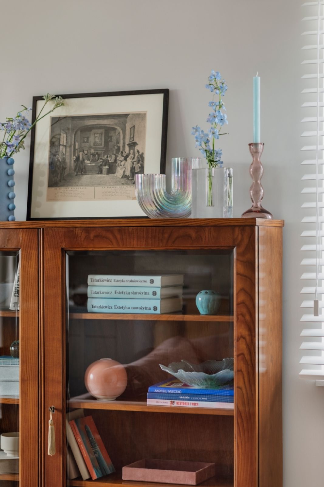 Połączenie błękitu z pudrowym różem wprowadziło do wnętrza świeżość i dużo pozytywnej energii. Co więcej, odcienie w pastelowym mieszkaniu dobrano tak, by idealnie współgrały z meblami vintage, np. komodą w salonie. Subtelne kolory stanowią piękne tło dla dodatków. Pamiątki, grafiki, kwiaty i książki to elementy, które nie tylko dekorują wnętrze, ale też oddają charakter właścicielki.