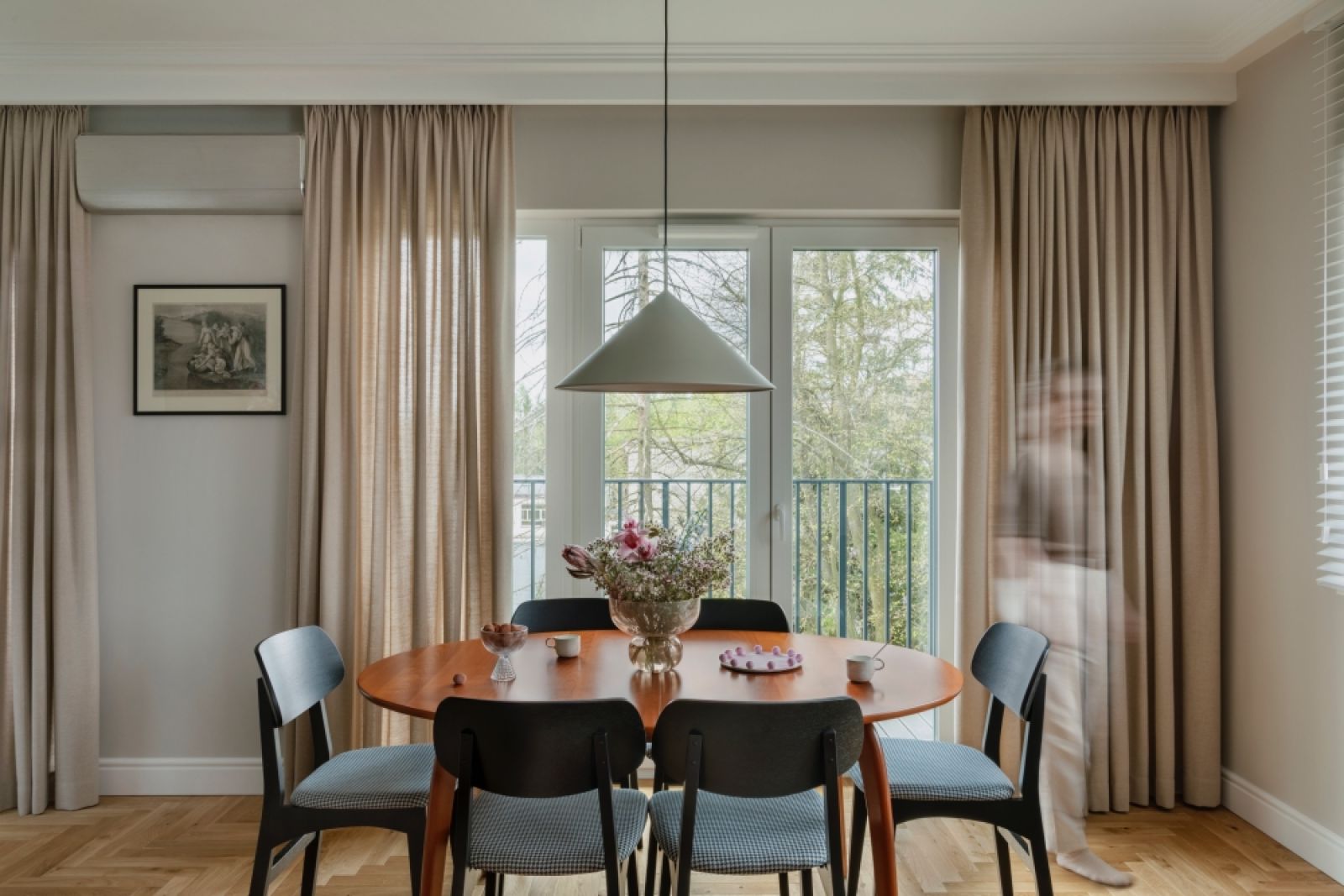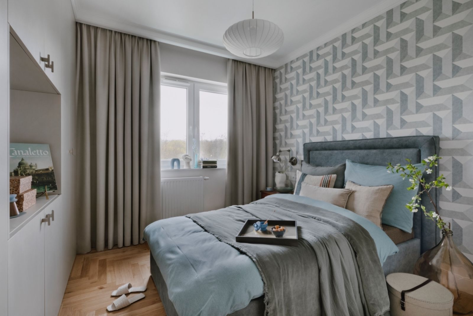 Pastelowe mieszkanie jest ciepłe, przytulne i eleganckie, a to za sprawą użytych materiałów: forniru dębowego, spieku kwarcowego na blatach i ścianie w kuchni oraz parkietu dębowego. Dekoracyjnym dodatkiem, który pojawia się w różnych strefach tego wnętrza są strukturalne tapety. To wszystko sprawia, że wnętrze jest spójne i stanowi piękną całość w eklektycznym wydaniu.