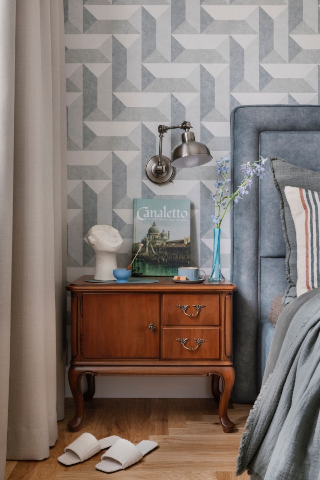 W mieszkaniu pojawiały się różne kolory, materiały, tekstury oraz różne stylistyki. Na przykład nowoczesne łóżko zestawiono z zabytkową szafką i loftowym kinkietem. W salonie znalazło się miejsce na zabytkową komodę, na której zależało właścicielce. By uzyskać ciekawszy efekt połączono ją z kolorową sofą oraz fotelami w pepitkę.