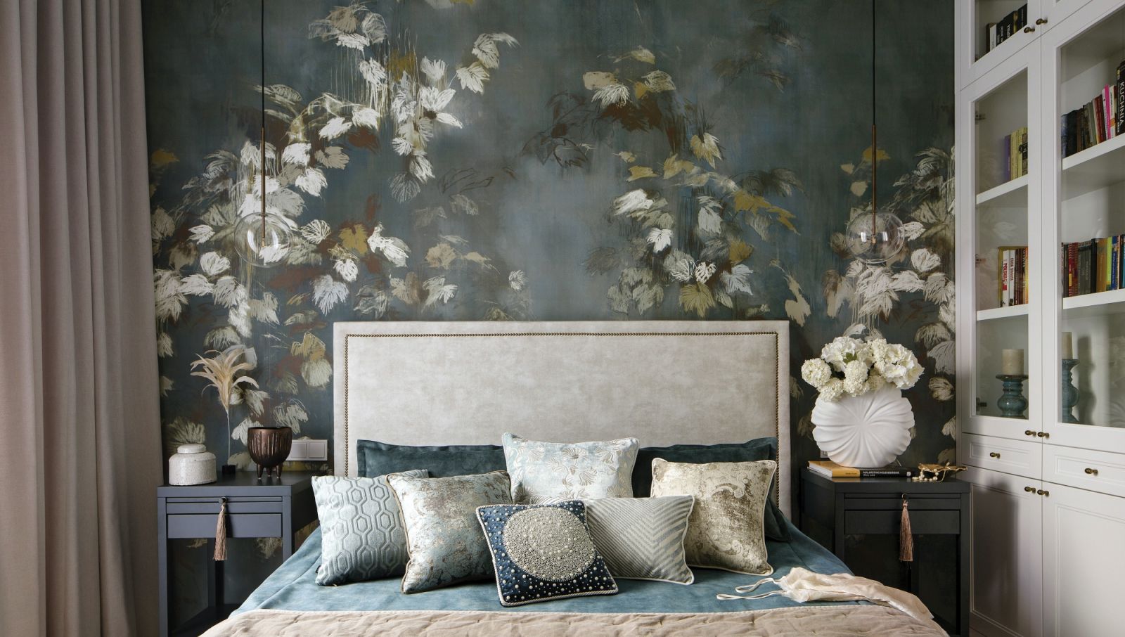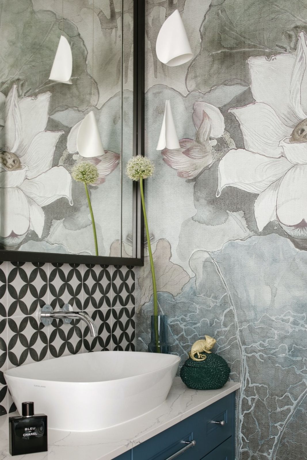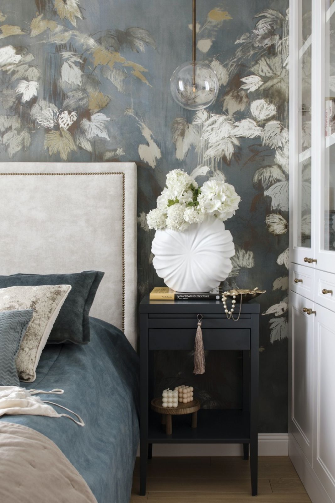 Mieszkanie w stylu hamptons – niebieskie akcenty i malarska tapeta w kwiaty robią wrażenie!