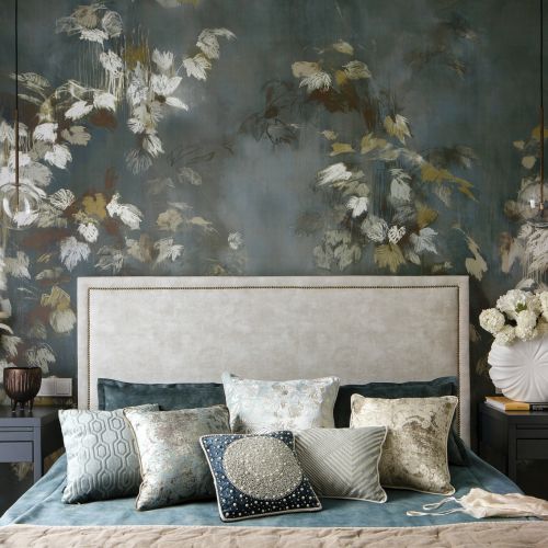 Wnętrza w stylu hamptons – z niebieskimi akcentami i malarską tapetą w kwiaty