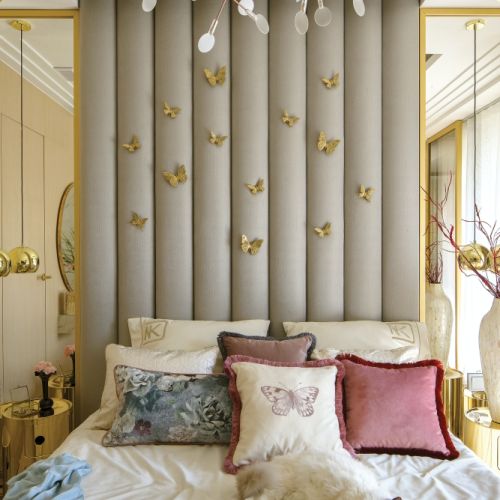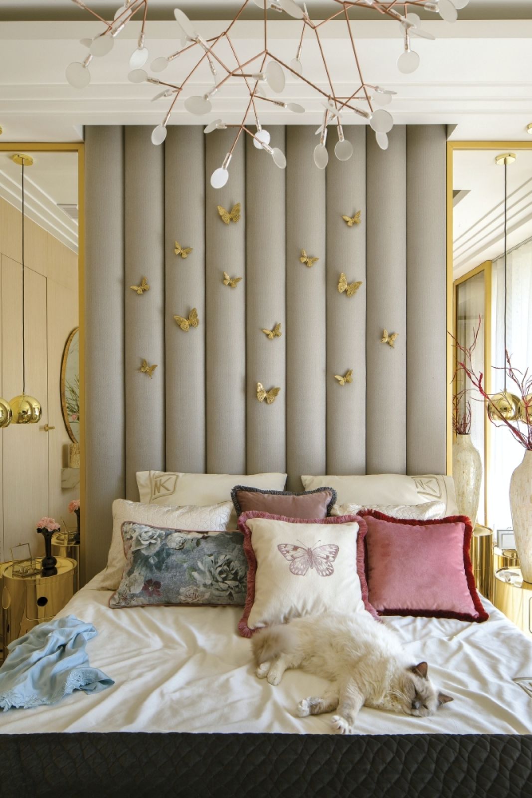 Kobieca sypialnia z pięknym tapicerowanym zagłówkiem i dekoracją z mosiężnych motyli