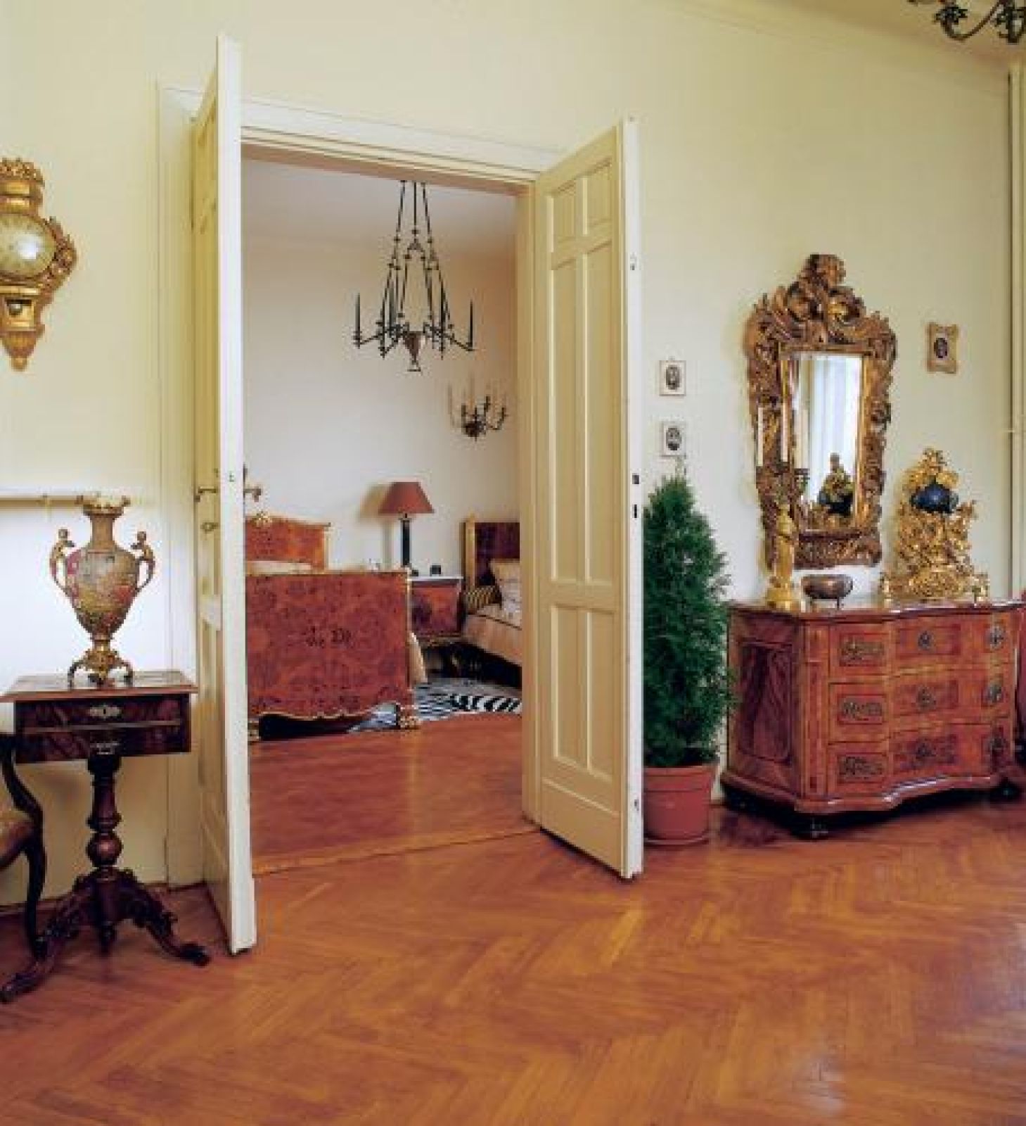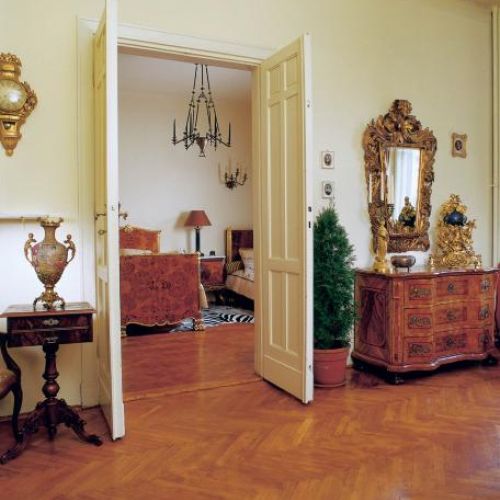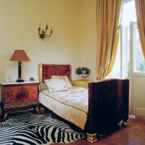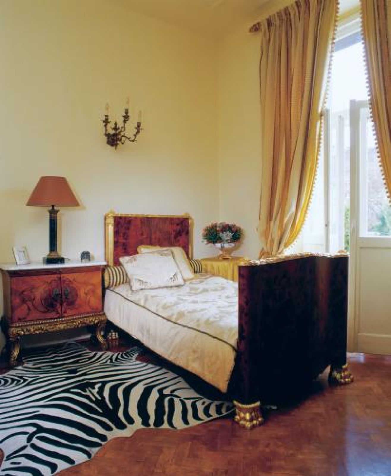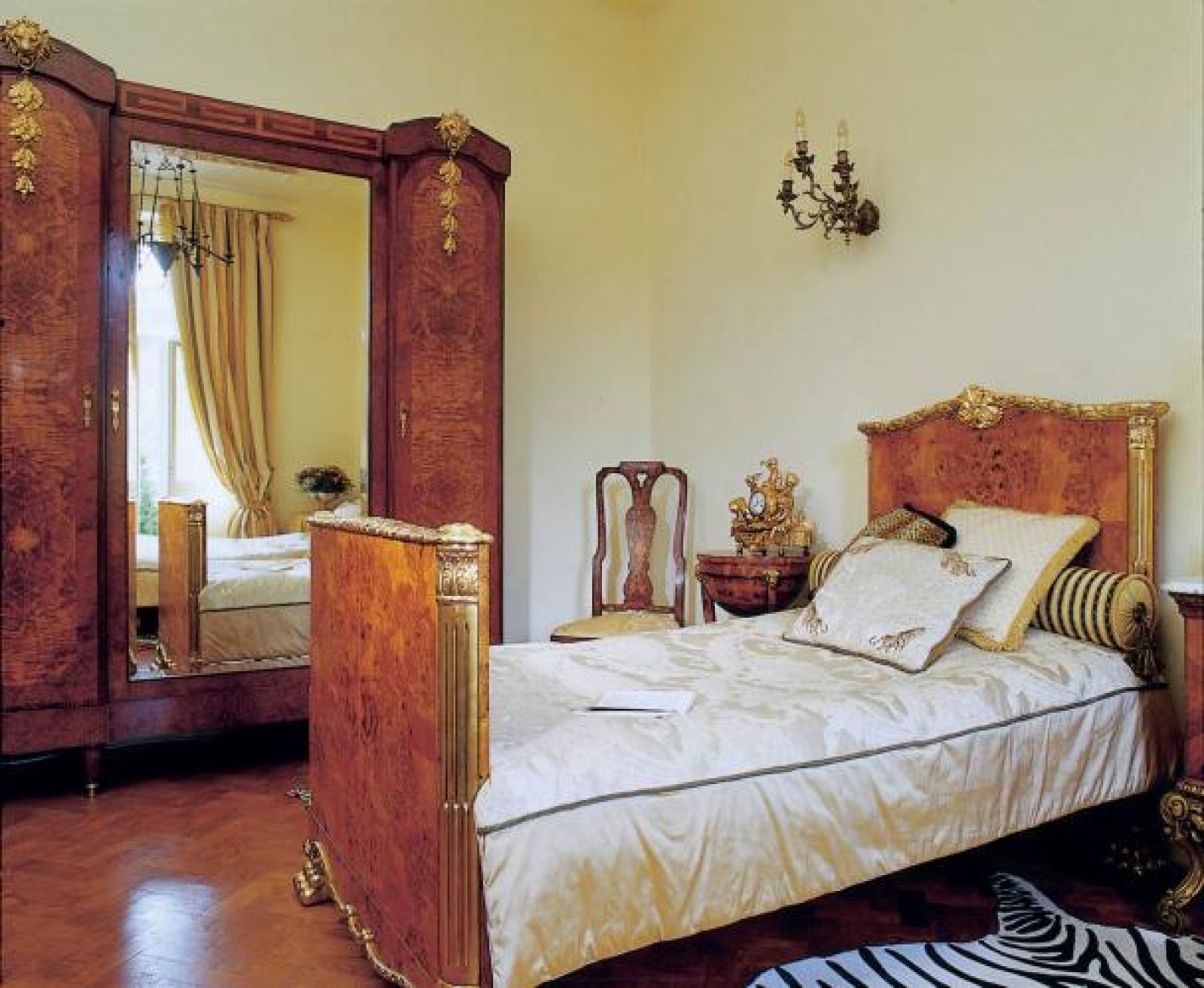 Salon otwiera się dwuskrzydłowymi drzwiami na sypialnię. Jej podniosły styl tworzą dwa empirowe łoża. Do nich dołączyła, intarsjowana wieloma gatunkami drewna, szafa z lustrem. Cylindryczny niciak zdobi barokowy zegar z pozłacanego brązu z rzeźbami Kupidynów w scenach winobrania. Egzotycznego smaku dodają rozłożone na podłodze skóry zebry i tygrysa.