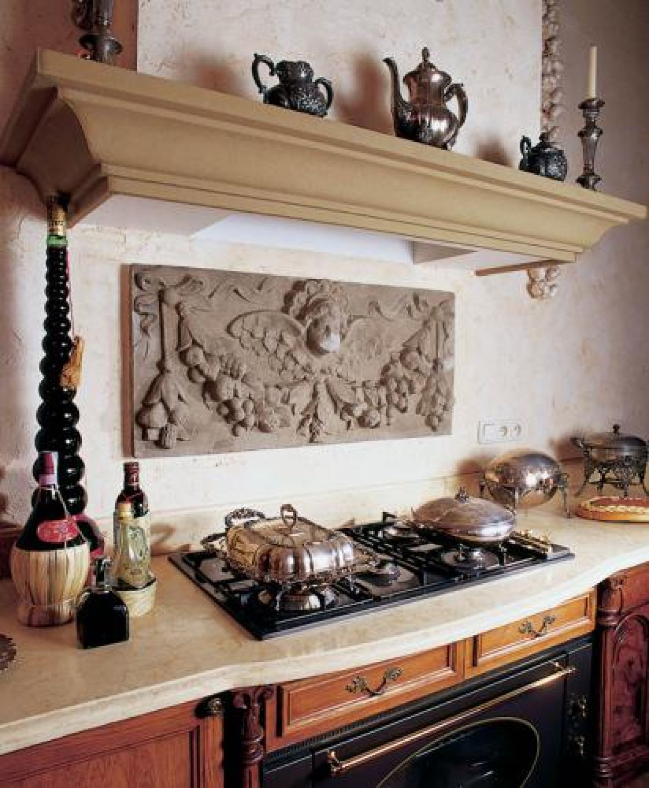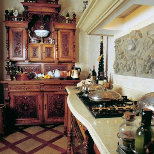 Na najbardziej eksponowanej ścianie zamontowano kuchnię otoczoną szafkami stylizowanymi na stare komody, a blat wyłożono kamieniem. Komin, wykończony gzymsem z piaskowca, potęguje wrażenie wysokości wnętrza i nadaje mu wyniosły charakter. Niezwykłą ozdobą tej części jest wmontowany w ścianę fragment portalu pochodzący z rozbieranej starej kamienicy. Na przeciwległej ścianie znalazł miejsce unikatowy zlew wykonany na zamówienie z miedzi młotkowanej w piasku. Z tego samego materiału zrobiona jest armatura. Miedziane są również misy, naczynia kuchenne, czajnik i toster, przywiezione przez panią Ewę z zagranicy. Kuchnię zdobią srebrne naczynia do podgrzewania potraw i podawania na stół – wyszukiwane z pasją na całym świecie.