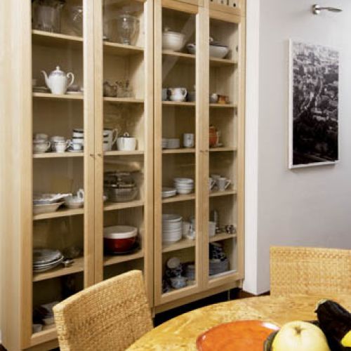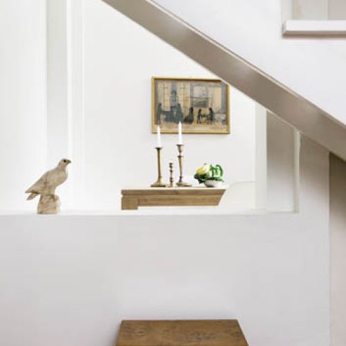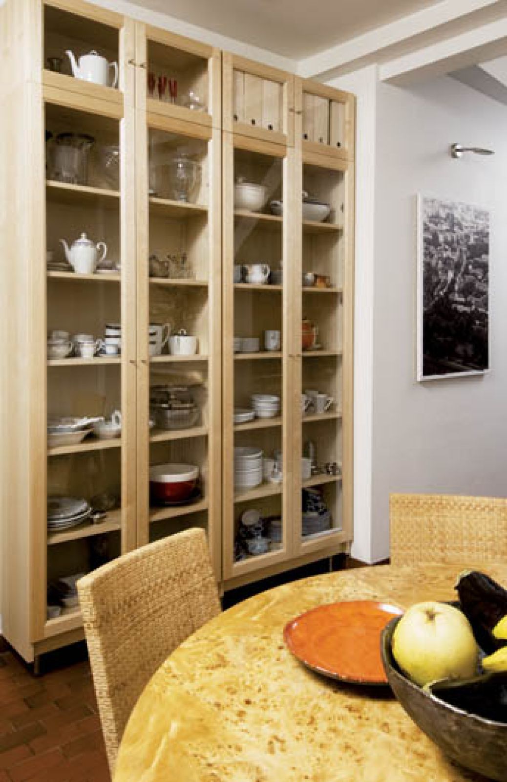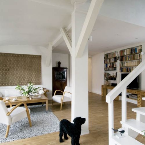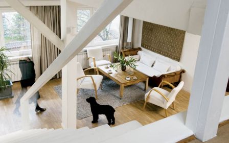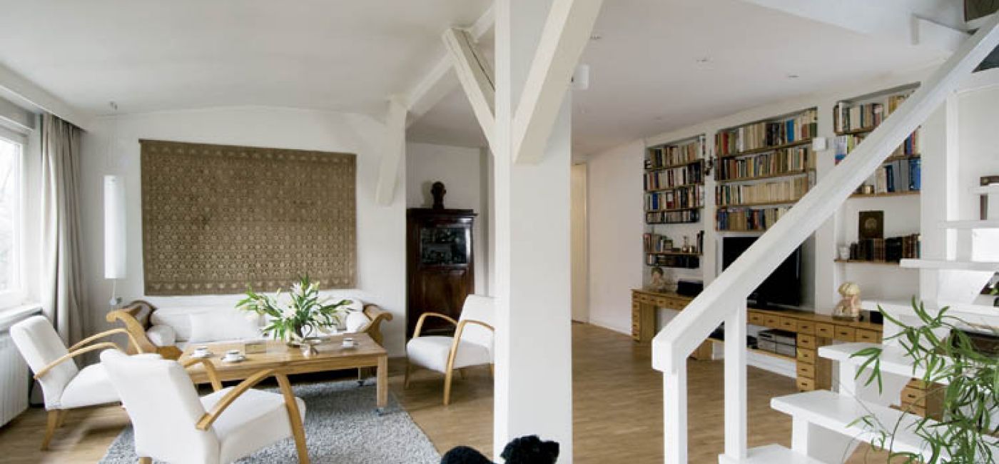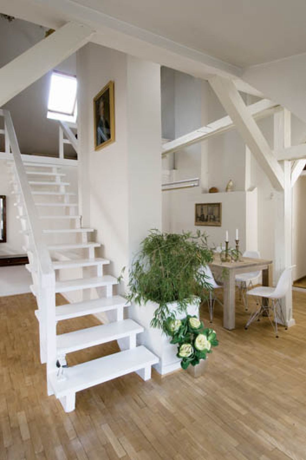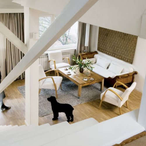 Na salon można spojrzeć z lotu ptaka, a raczej – anioła. Króluje na antresoli, groźny jak harpia. Chroni domowników przed złymi siłami oraz zbyt długimi nasiadówkami gości – co się zdarza, bo dom przyjazny, z dobrą wyżerką. Podczas większych przyjęć w ruch idzie długi, rozsuwany stół. W kuchni „władzę trzyma” Basia, ale i pan domu ma tu swoją niewielką działkę: ażurową konstrukcję na kolekcję win, skupowanych we Francji. Przed wejściem do kuchni (bez drzwi) ustawiony został stół kombinowany: stalowe nogi plus blat z czeczotki utwardzonej żywicą. Do tego wyplatane krzesła.