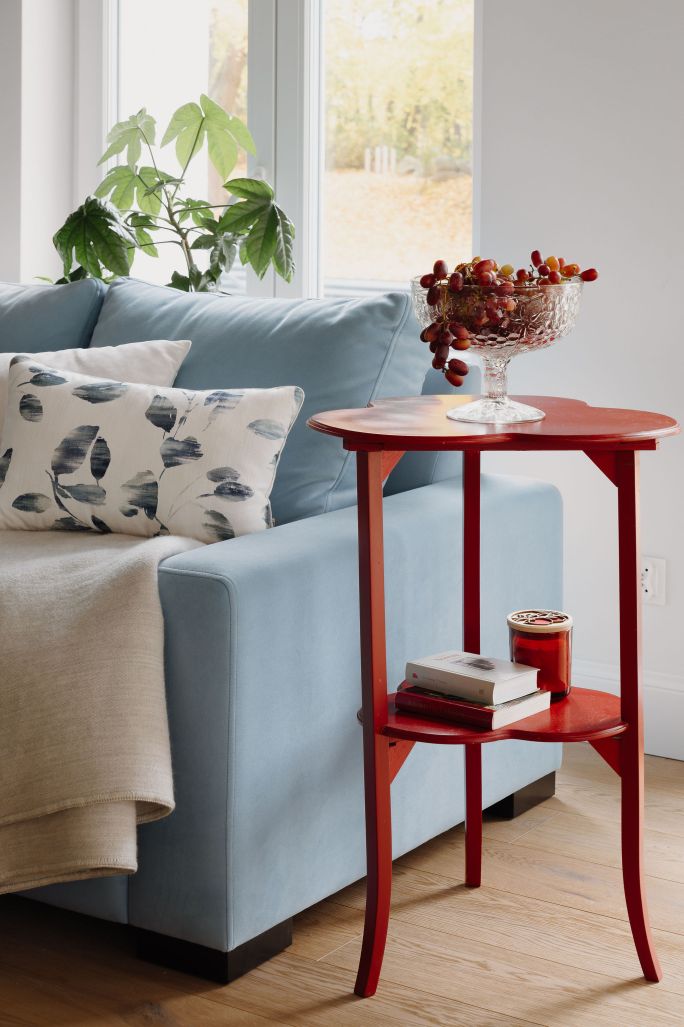 Kolorystycznym akcentem, który dodaje aranżacji charakteru, jest stary stolik po babci – odnowiony i pomalowany na intensywny odcień czerwieni. Pięknie kontrastuje z błękitem tapicerki i ociepla kompozycję, podbijając tonacje naturalnego drewna.