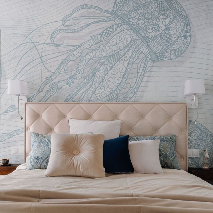 Inwestorom zależało na tym, by mieć sporo miejsca do przechowywania – tak, aby nawet podczas krótszych czy dłuższych pobytów nie żyć „na walizkach”, tylko cieszyć się porządkiem i wygodą. Garderobę udało się w pełni zabudować pojemnymi szafami wykonanymi na zamówienie. Fronty w kolorze gołębiej szarości dobrano tak, by otwarta na sypialnię przestrzeń ładnie komponowała się z jej wystrojem. Szarość wpadająca w błękitnawą tonację została idealnie zgrana z niebieską tapetą w morskie motywy, nadając sypialni subtelny, kojący charakter.