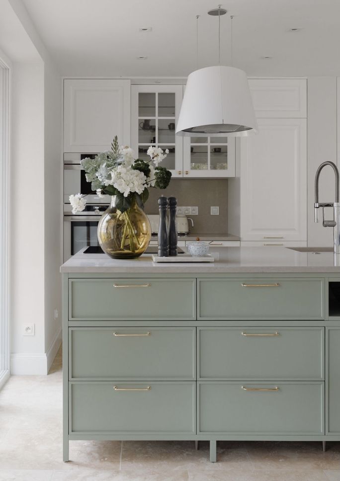 Wyspa pełni rolę kontuaru, przy którym można przygotować i zjeść szybkie śniadanie lub wypić kawę. Utrzymana jest w pięknym odcieniu seledynowej zieleni – lekkiej dla oka i doskonale skomponowanej z bielą szafek i witrynek. Proste, złote uchwyty dodają całości biżuteryjnego sznytu, wyglądają bardzo elegancko, ale nie pretensjonalnie.