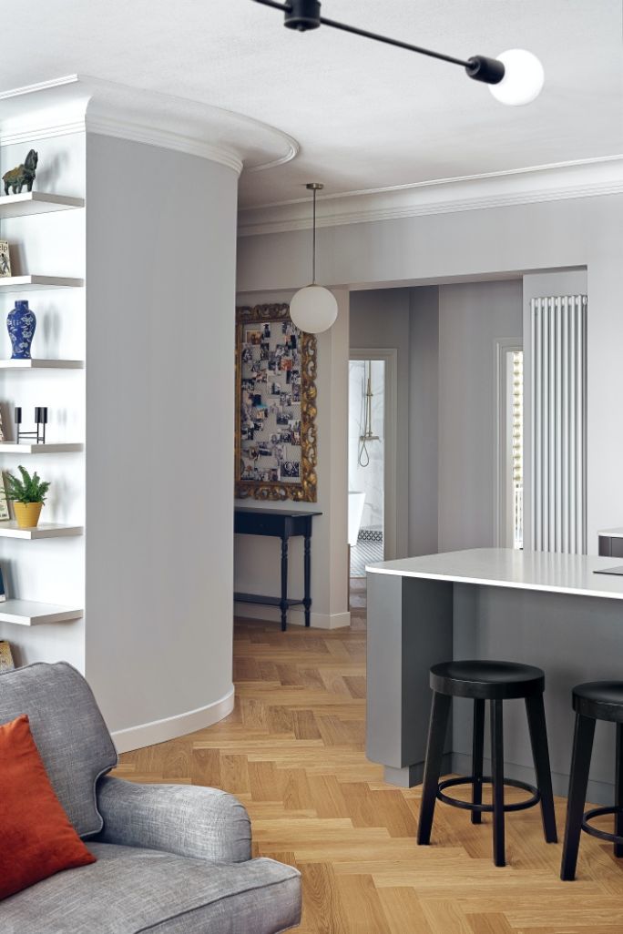 Zaokrąglona ściana przy wejściu do salonu (niewykluczone, że oryginalna) przywodzi na myśl architekturę modernizmu. Projektantka powtórzyła tę krągłość w kuchennej wyspie i zabudowie, nawiązując również w ten sposób do klatki schodowej z lat trzydziestych. – Styl retro nadały mieszkaniu też elementy ze szczotkowanego mosiądzu: armatura, detale lamp, uchwyty i klameczki – mówi architekt. – Również grzejniki i drzwi, choć współczesne, stylizowane są na stare. Magda zaś dodaje, że chyba największą niespodzianką było, gdy ich sąsiadka zachwyciła się podłogą, którą położyli w łazience. – Dokładnie tak tu kiedyś było! – stwierdziła, a przecież wyszło to trochę przez przypadek. Ale to był znak, że stylizacja poszła w dobrą stronę.