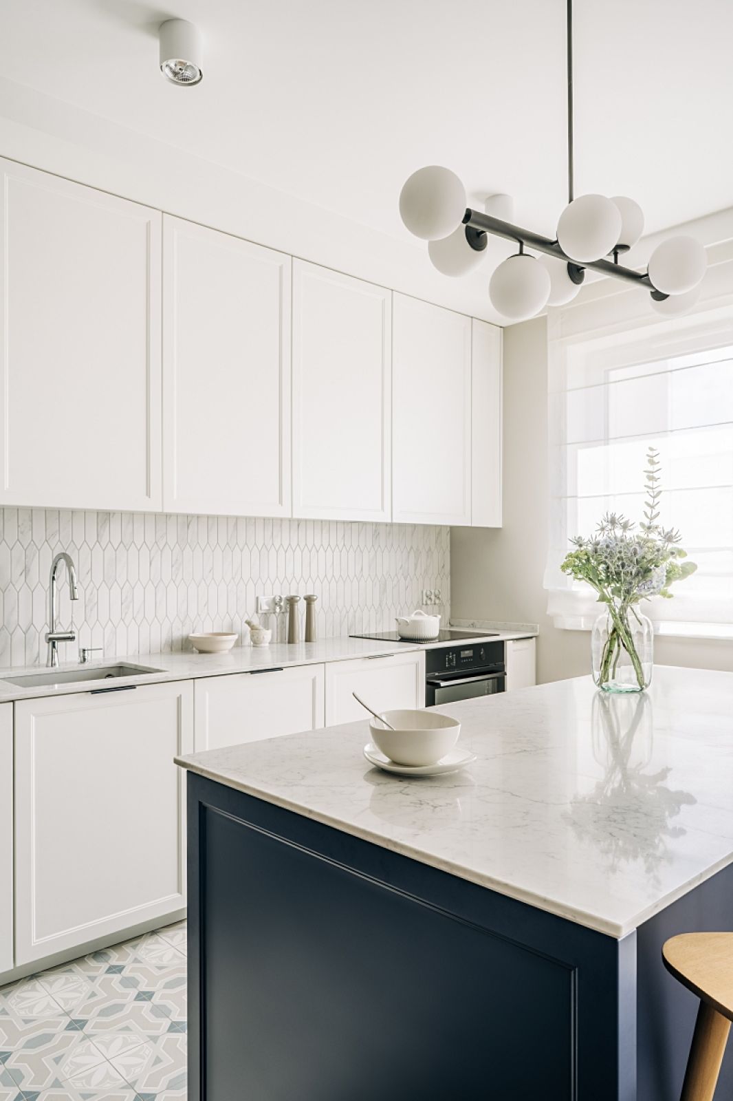 To oczekiwanie inwestorki udało się zrealizować w stu procentach. W całym apartamencie przeplatają się klasyczne detale i nowoczesne akcenty – frezowania frontów i drzwi zestawione zostały z lekkimi, geometrycznymi liniami mebli. Subtelny detal, jak zafrezowanie blatu wyspy kuchennej, wprowadza unikatowość i rytm w przestrzeni dziennej. Wzorzyste płyty na podłodze w kuchni ładnie korespondują z dębowymi deskami w salonie, a eleganckiego sznytu dodaje mozaika ułożona między szafkami z sześciokątnych cegiełek imitujących marmur. Ciemny granat wyspy kontrastuje z bielą szafek, a całość ociepla kaszmirowa zabudowa meblowa z wolno stojącą nowoczesną lodówką.