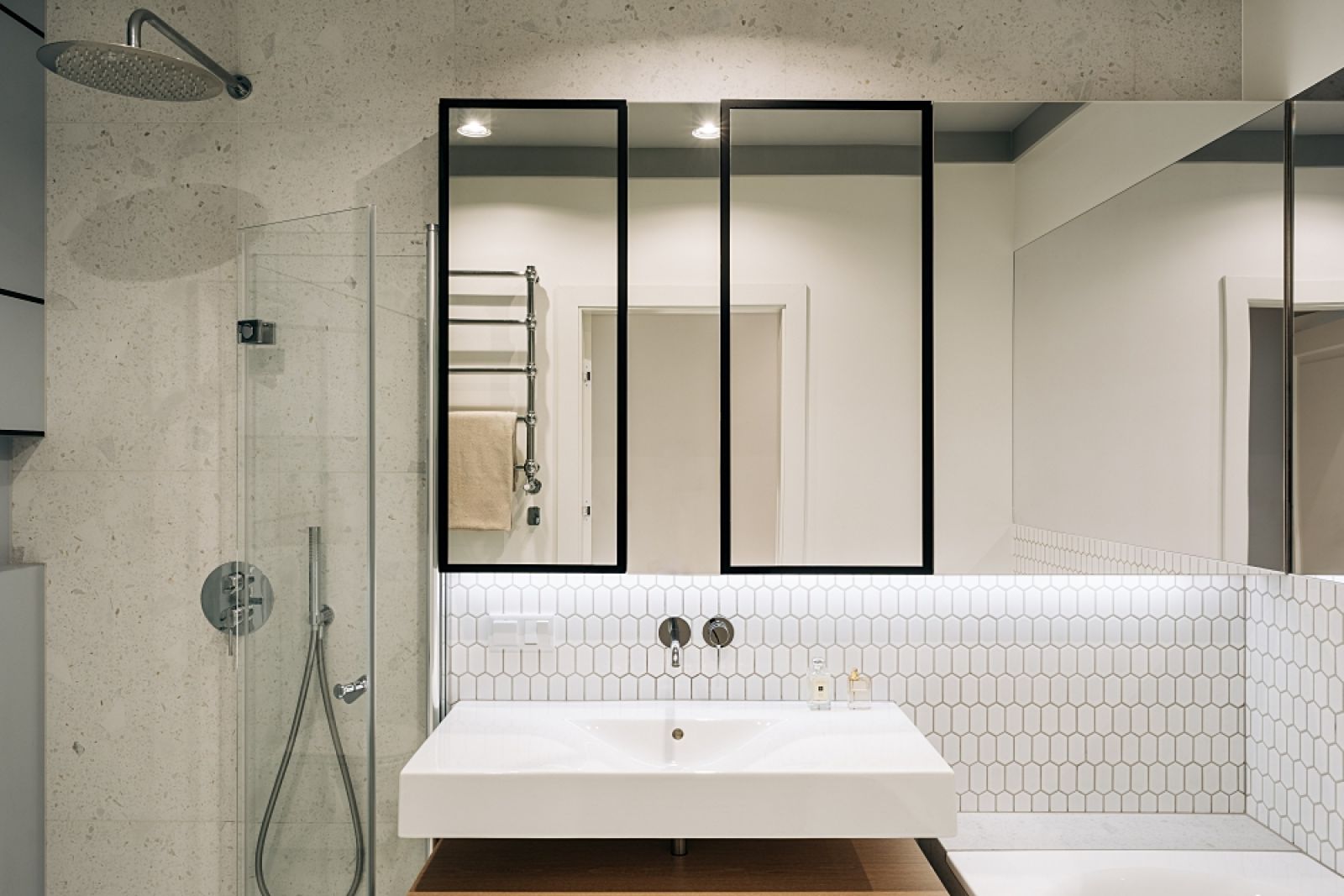 Właścicielka nie chciała wprowadzać do łazienki więcej kolorów. Zależało jej na stonowanej tonacji, która tworzy relaksacyjną, spokojną aurę. Projektantka zaproponowała jedynie czarne listwy na lustrach i zabudowie meblowej jako element, który sprawi, że coś się zadzieje, ożywi i doda jednolitej kolorystycznie przestrzeni mocniejszego wyrazu.
