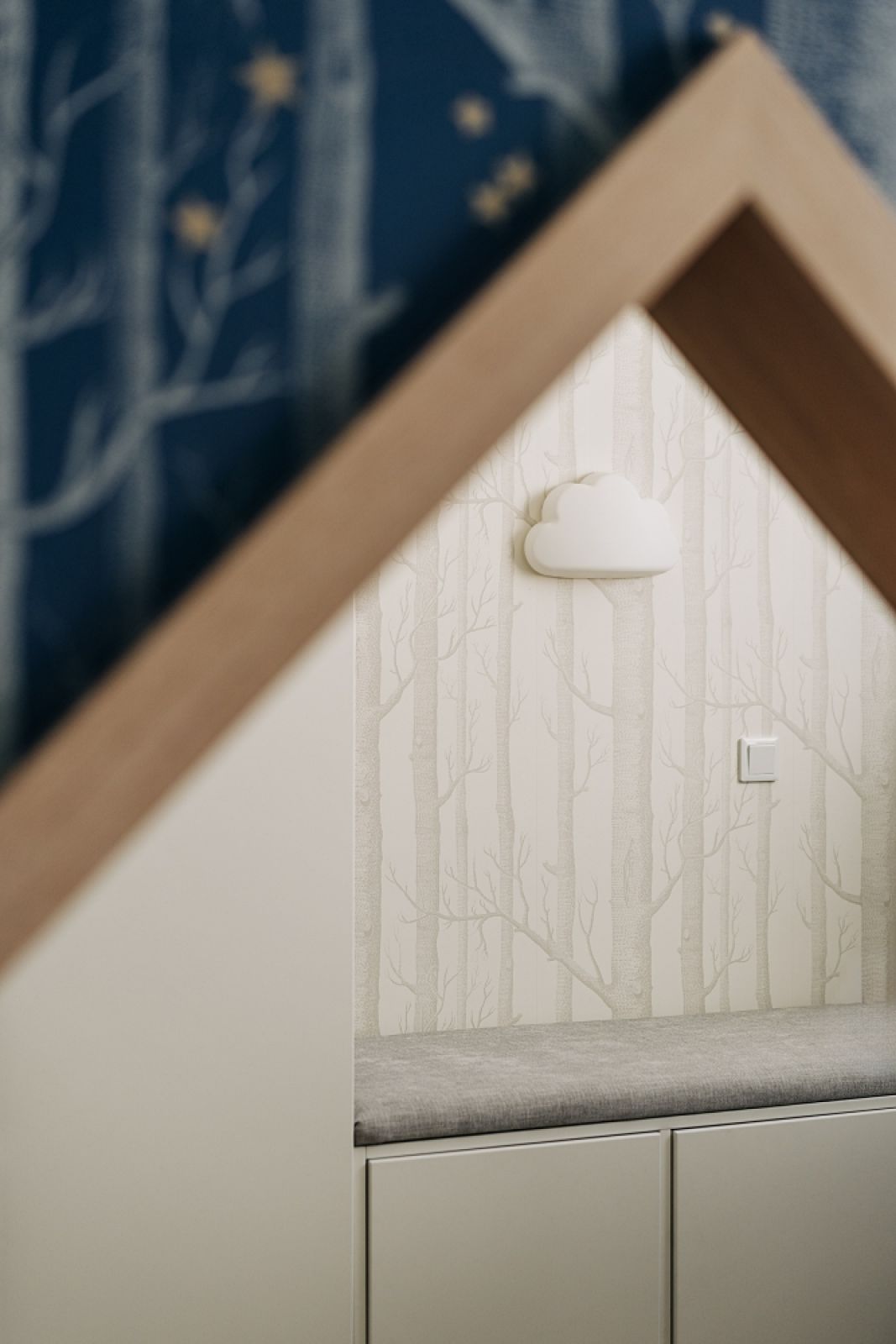Wyjątkowym elementem są pokoje chłopców – dwa osobne światy połączone ukrytym przejściem, stworzonym specjalnie dla małych mieszkańców. Jeden pełni funkcję sypialni, drugi bawialni, a ich kontrastowe oblicza podkreślają ikoniczne tapety Woods marki Cole & Son. To rozwiązanie nadaje przestrzeni bajkowy charakter i jednocześnie wspiera codzienną swobodę dziecięcej zabawy.