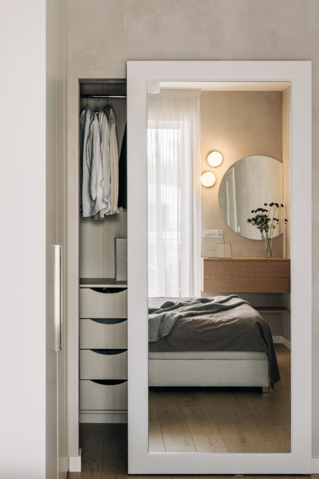 Cała aranżacja jest oparta na kontrastach bieli i granatu, a chłodne zestawienie ociepla rysunek drewna. W centralnej części stanęło komfortowe łóżko z dużym, rozpostartym na całej ścianie pikowanym zagłówkiem. Pionowe przeszycia sprawiają, że wnętrze wydaje się optycznie wyższe. To właśnie ściana nad wezgłowiem została pomalowana na elegancki, głęboki granat, który wprowadza tu mnóstwo przytulności. Tuż przy oknie udało się zmieścić na życzenie inwestorki toaletkę z podwieszaną komodą i okrągłym lustrem, a obok łóżka stanęła duża szafa na sezonowe sprzęty. Przesuwny, lustrzany front, który optycznie jeszcze bardziej powiększa pomieszczenie, jest wejściem do niewielkiej garderoby.