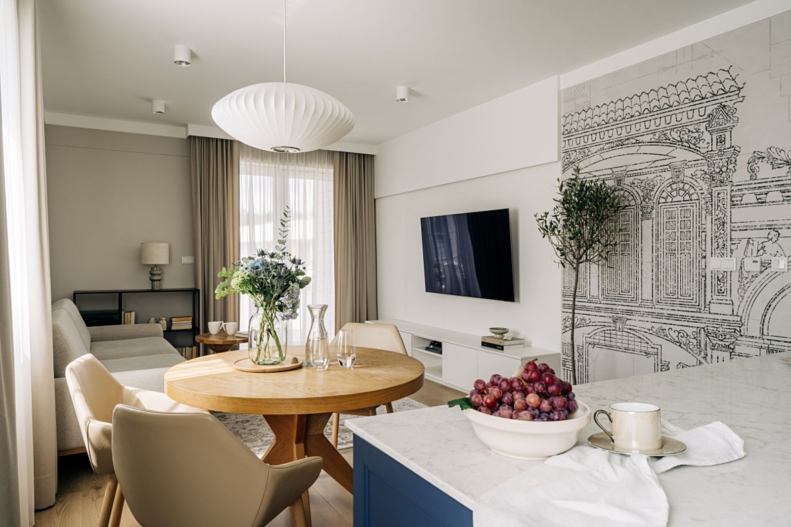 Tak, by wnętrze nawiązywało trochę detalami do historycznej części Łodzi, ale równocześnie było uszyte na miarę młodej rodziny. W salonie projektantka zaproponowała ciekawe rozwiązanie – tapetę na ścianę z architektonicznym widokiem starych kamienic. Dekoracja nie przytłacza intensywnym deseniem, bo wzór jest „kaligrafowany” prostą graficzną kreską, ale pięknie zdobi, a stonowana kolorystyka stapia się z neutralnymi odcieniami ścian. Oryginalny dekor łączy część wypoczynkową salonu z otwartym aneksem kuchennym.
