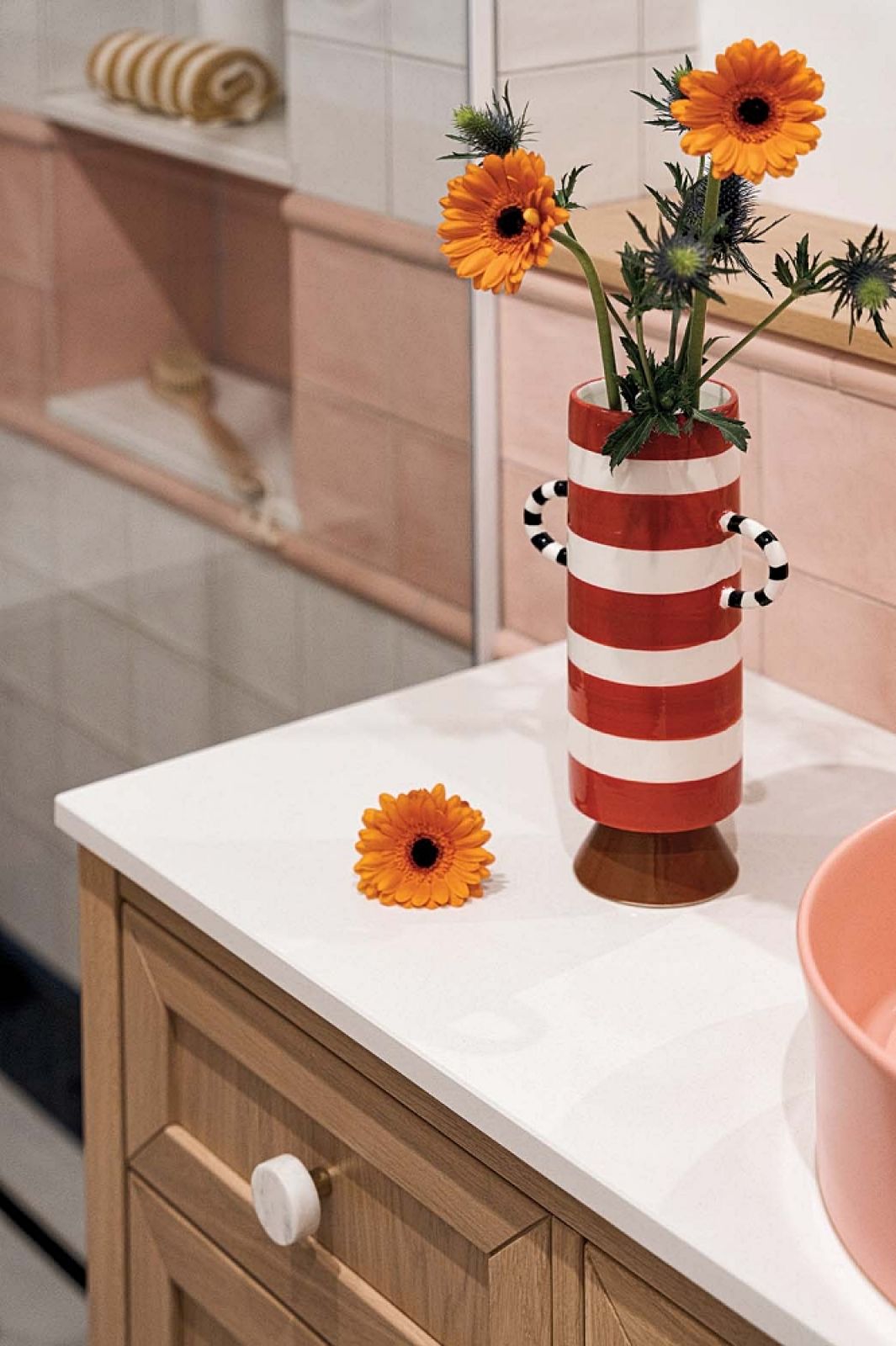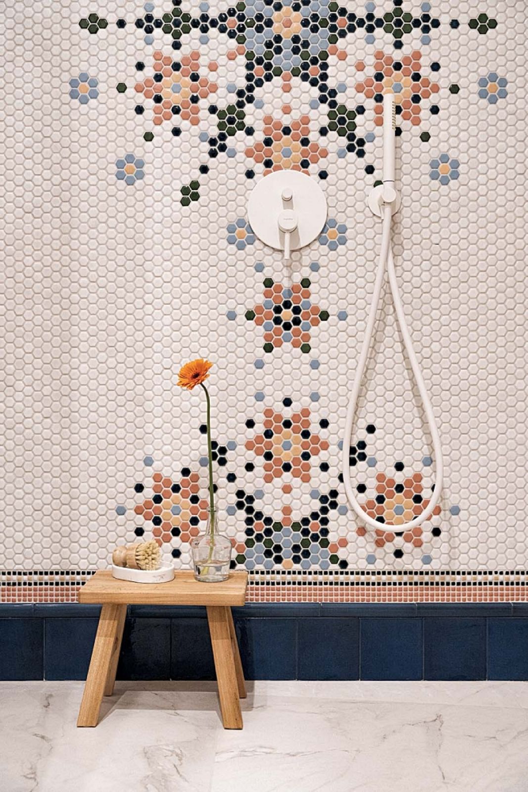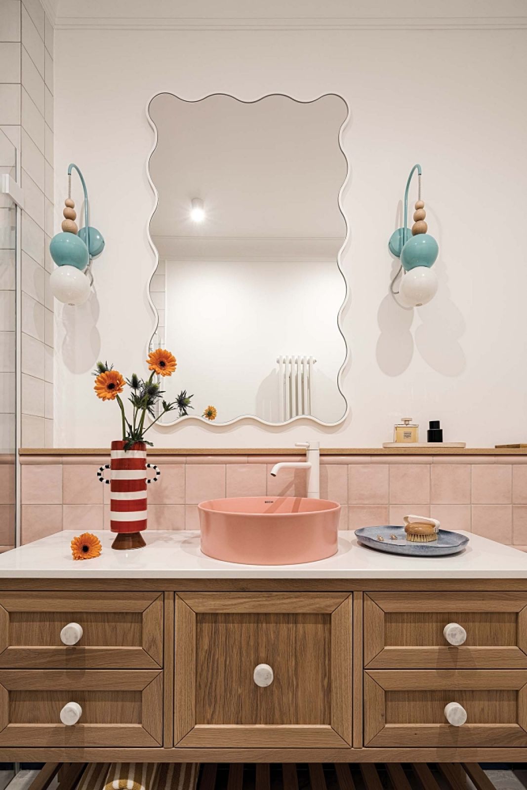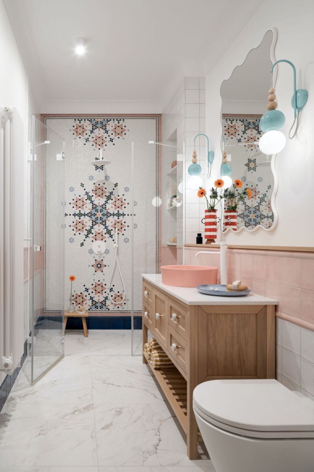 Z kolei łazienka to efektowna gra kolorów i mozaikowego wzoru – zamiast klasycznych płytek ceramicznych Emilia zaproponowała mozaikę, której wzór zaprojektowała sama, a wykonanie zleciła firmie Ardea. – Klaudia i Rafał bardzo się zapalili do tego pomysłu – mówi projektantka – a nawet chcieli podkręcać efekt: „A może jeszcze damy różową umywalkę? Dołóżmy pofalowane lustro!". Właściciele dali mi zielone światło, by wrzucać elementy nietuzinkowe, odważne.