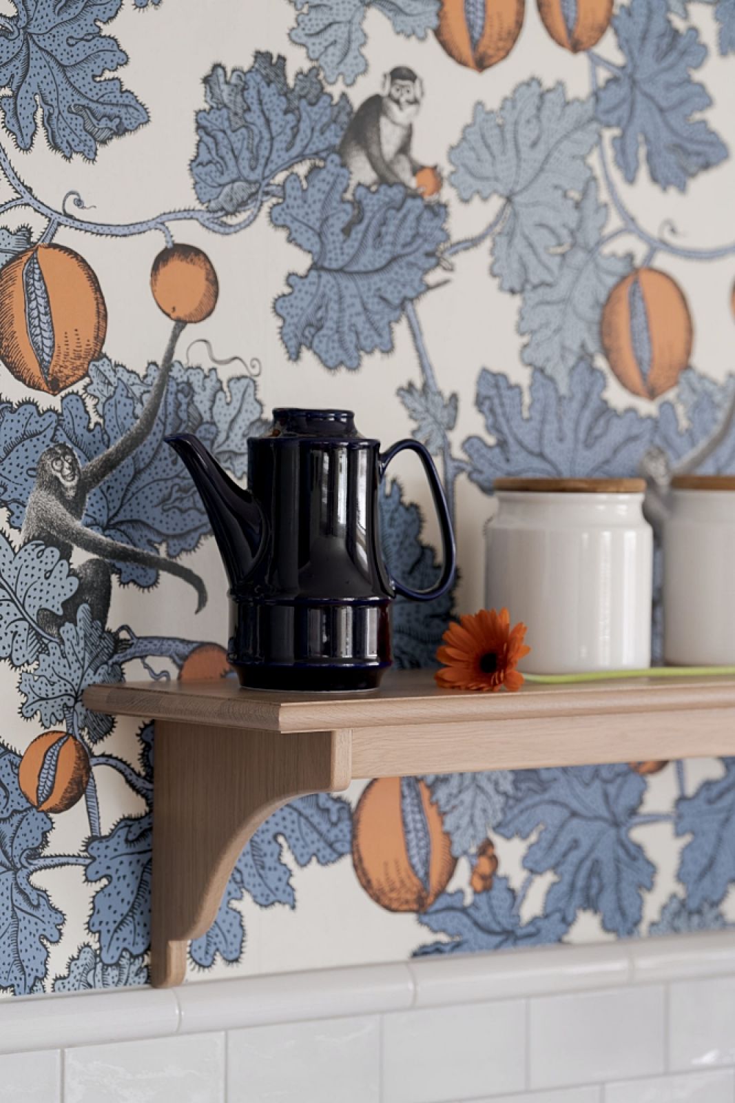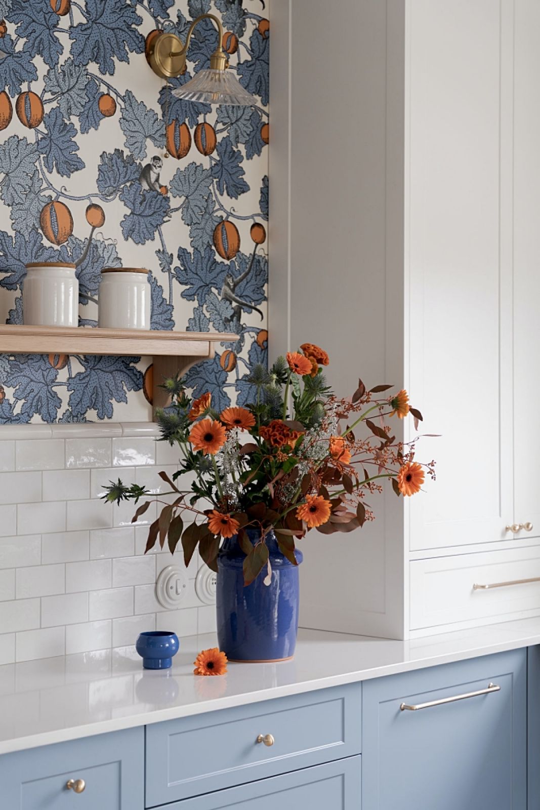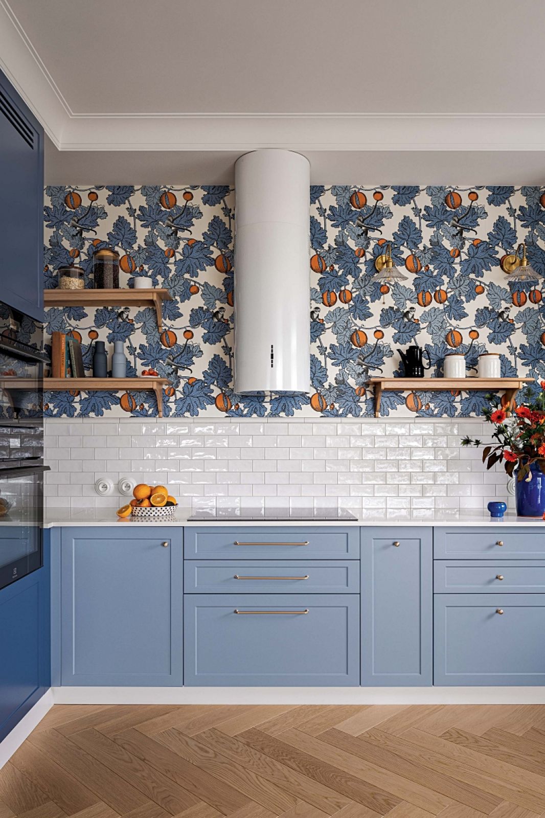 Wzorzysta tapeta zamiast górnych szafek – jak powstała niebiesko-pomarańczowa kuchnia