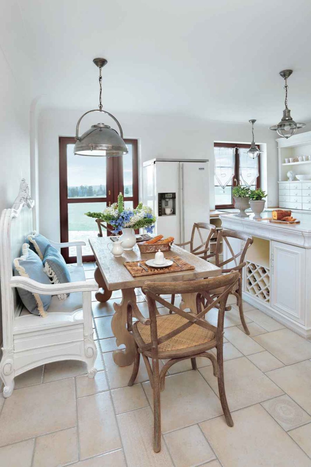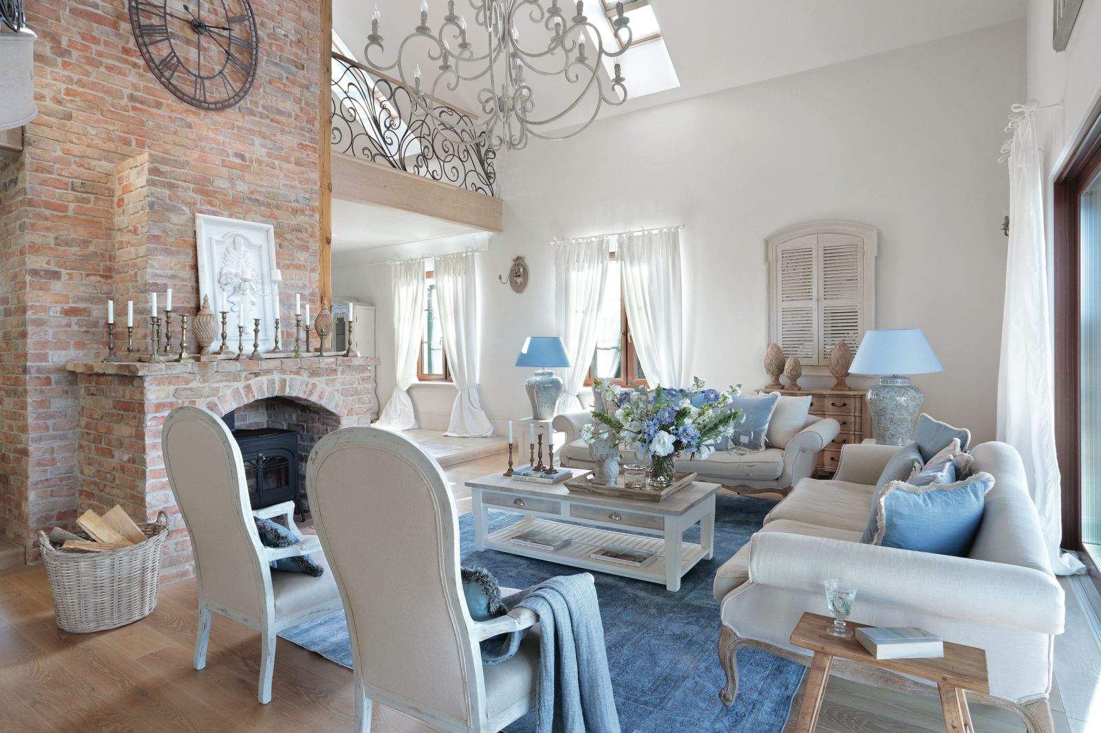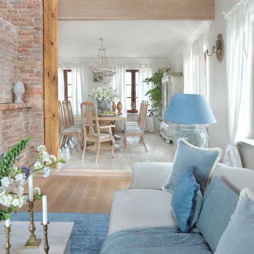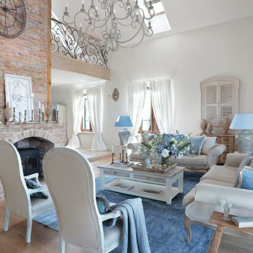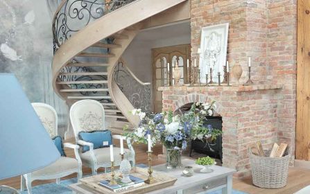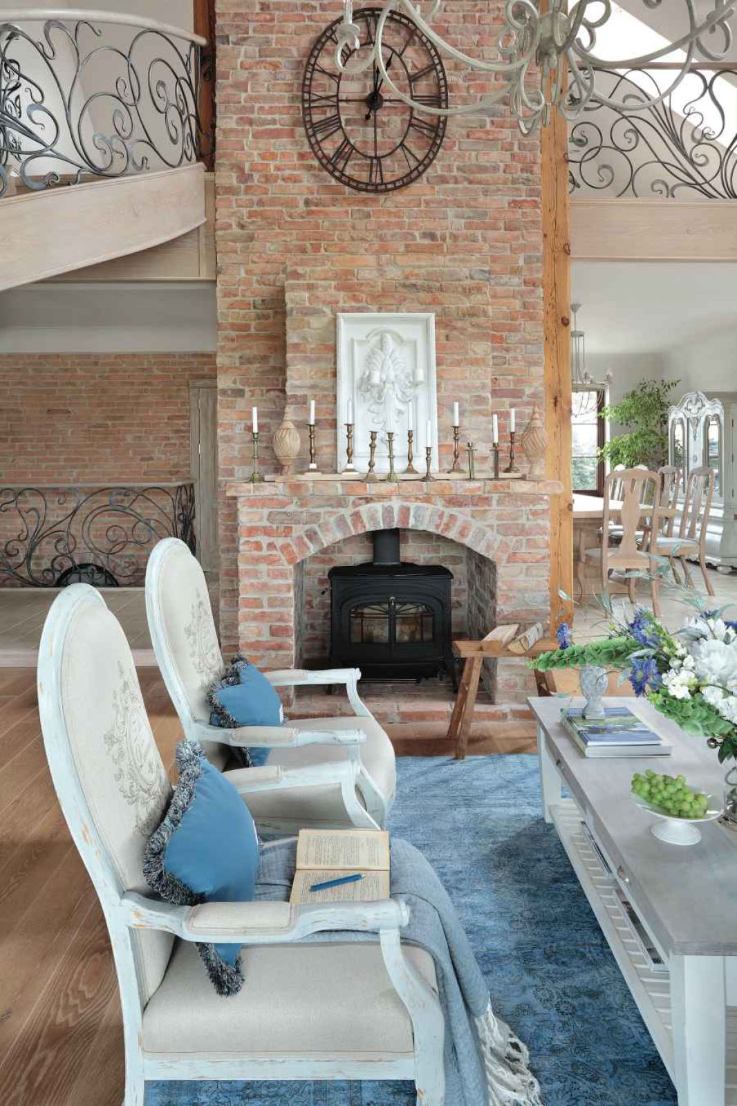 Ten dom miał być artystyczną kreacją. Właściciele, wspaniali ludzie, dali mi mnóstwo swobody. Na dodatek mieli odwagę. Bo kto w dzisiejszych czasach w eleganckim salonie pozwoli sobie na nieotynkowany kominek – na nagie, chropowate cegły jak w jakimś zakładzie hutniczym?! A ja uwielbiam takie kontrasty – z jednej strony formy stylowe, zakręcone, a z drugiej nieokrzesane. Wybrałam meble z rzeźbionymi ramami i frontami, ale muśnięte bielą. Podłogi chcieliśmy dopasować kolorystycznie do płytek. Dębowe deski zostały wybarwione, lekko postarzone i woskowane.