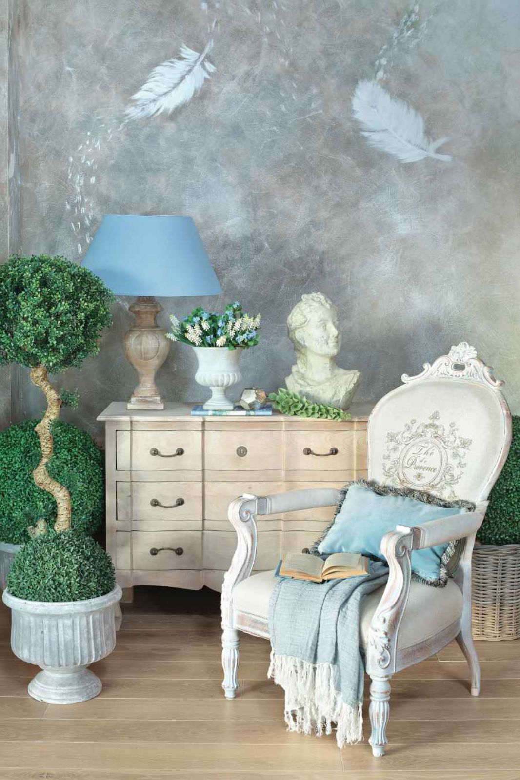 Zastanawialiśmy się, co zrobić z wysoką białą ścianą przy schodach. Właściciele nie chcieli obwieszać jej obrazami, zresztą mogłyby się gryźć z bardzo dekoracyjną balustradą. Nie wchodziły też w grę tapety. Padł pomysł, żeby to był mural. Kilka wieczorów wybieraliśmy temat. Lekki i zwiewny. Wygrały piórka rozrzucane przez dziewczynę. Na rusztowaniu przez trzy tygodnie stała artystka Małgorzata Kaczmarek. Wykonała strukturalny tynk i uzyskała efekt postarzenia, a następnie namalowała farbami akrylowymi główny motyw. Na koniec wszystko zatarła i „przypudrowała”, żeby było ciekawiej.