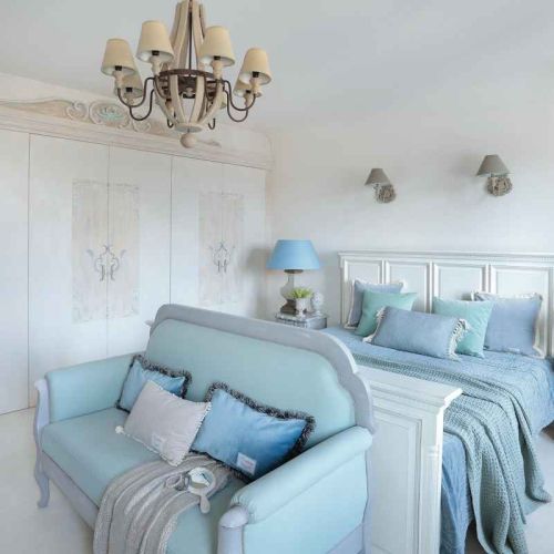 Garderoba to kolejne nietypowe dzieło w tym domu. Powstała przy sypialni i prowadzą do niej drzwi trochę jak z bajki. Mają namalowane w pastelowych barwach, również przez Małgosię, ornamenty i wyrzeźbiony fronton. A w rzeczywistości porusza je nowoczesny mechanizm – przesuwają się na prowadnicach Hettich. Dzięki tej szafie w sypialni zrobiło się romantycznie i przytulnie. Dla mnie jest niepowtarzalna.