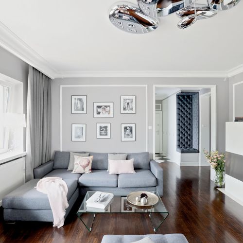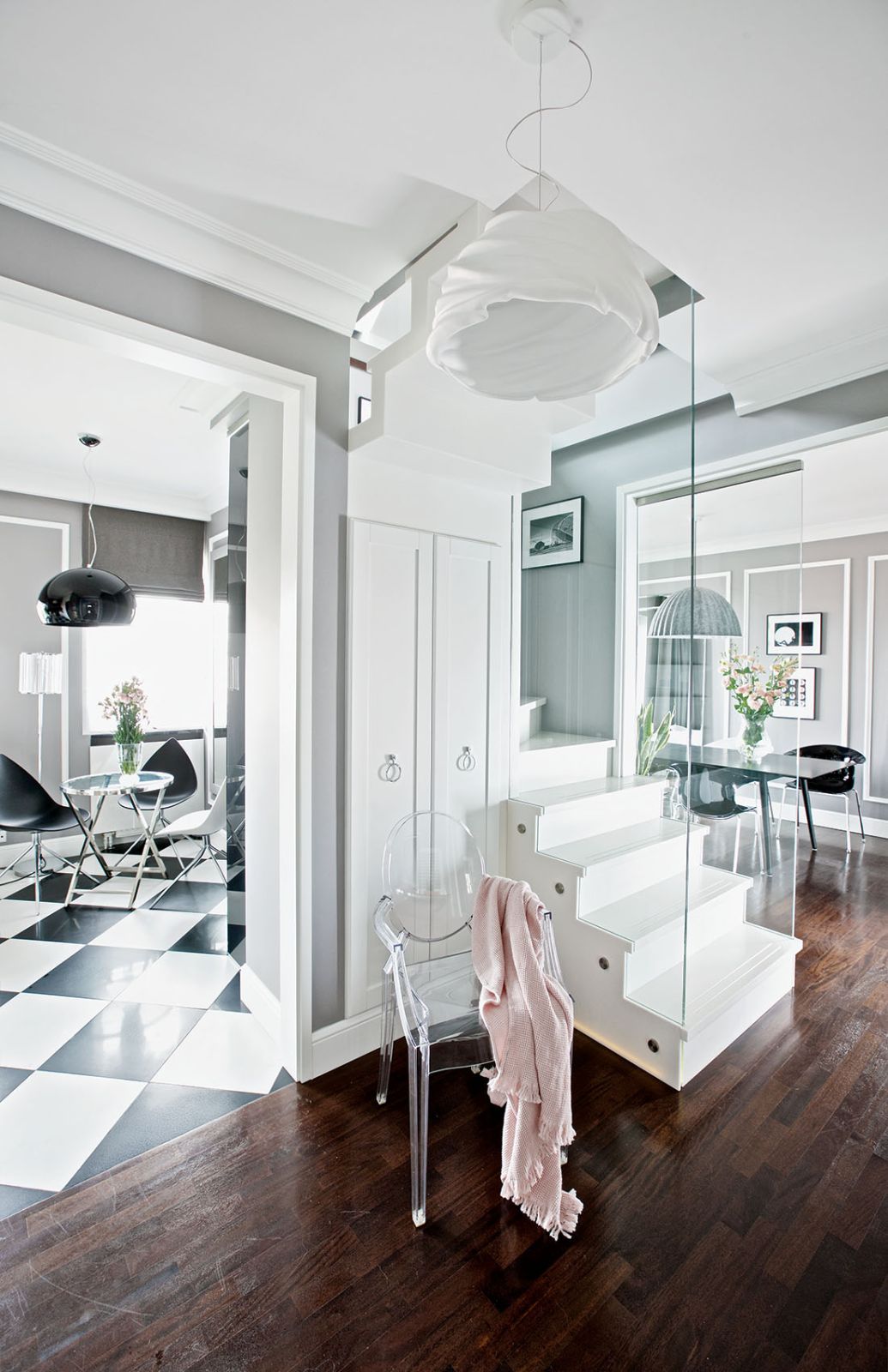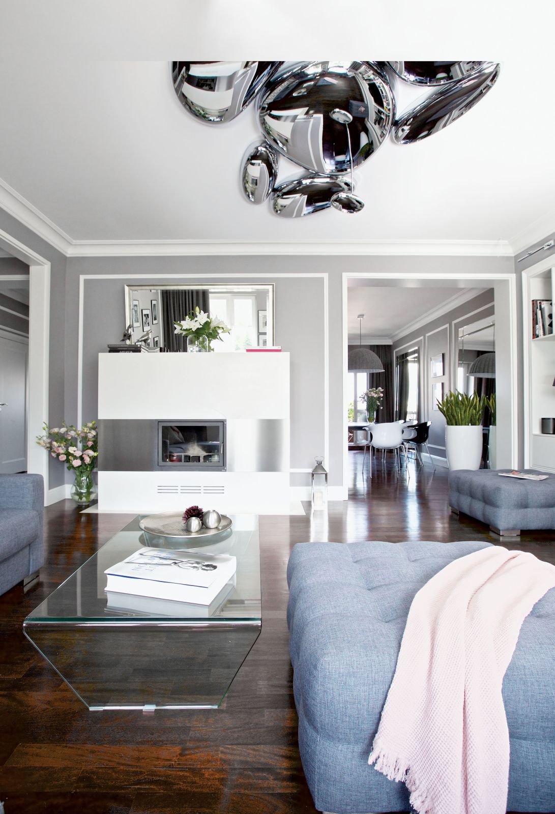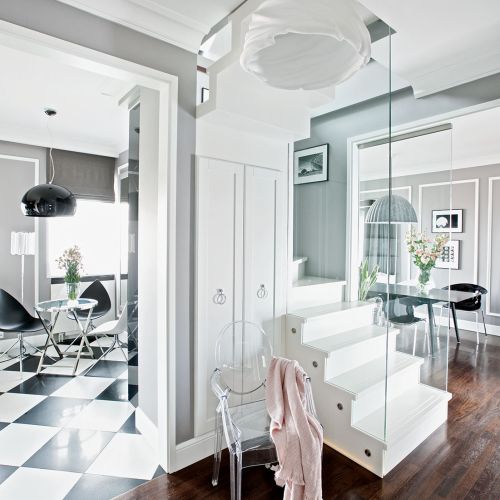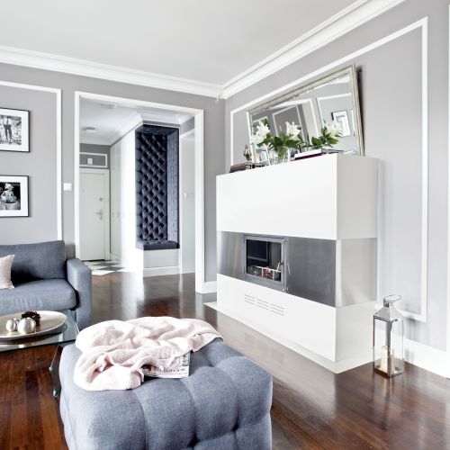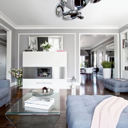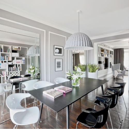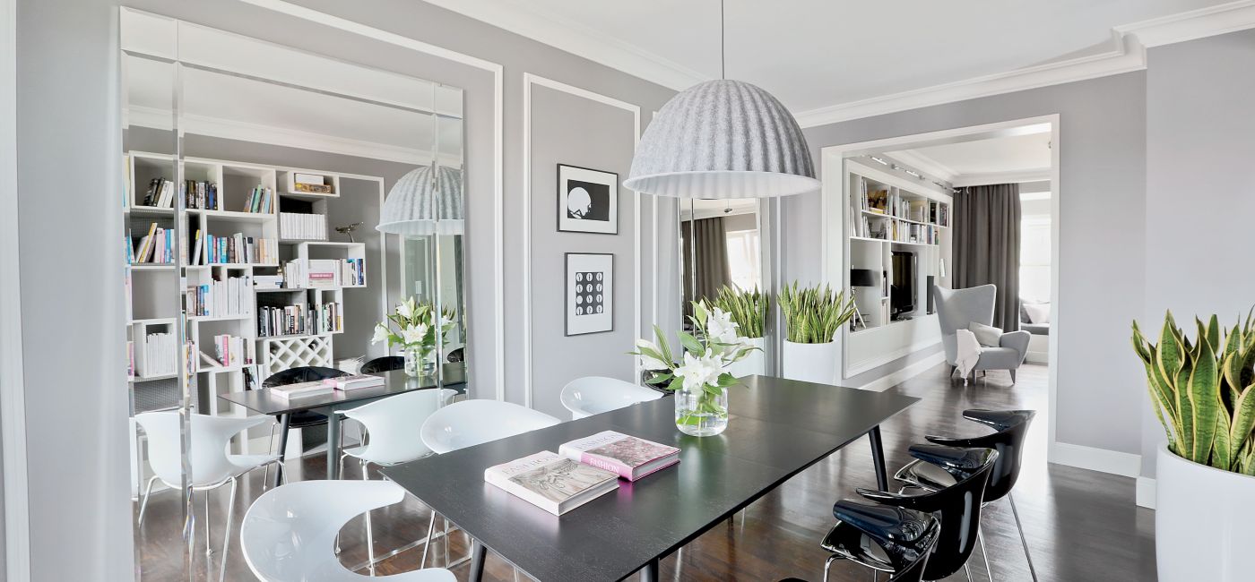 Wspólnym mianownikiem dla tylu pasji i zainteresowań okazała się spokojna klasyka. – Sztukaterie, biele, gołębi kolor – opowiadają architekci. – Genialna jest zwłaszcza szarość, bo z niczym się nie gryzie. Na jej tle świetnie wyglądają i mocne elementy graficzne, i czarno-białe szachownice, i kryształowe lustrzane ściany, i minimalistyczne duńskie przedmioty, wreszcie – włoski dizajn czy luksusowe meble firmy Eichholtz.