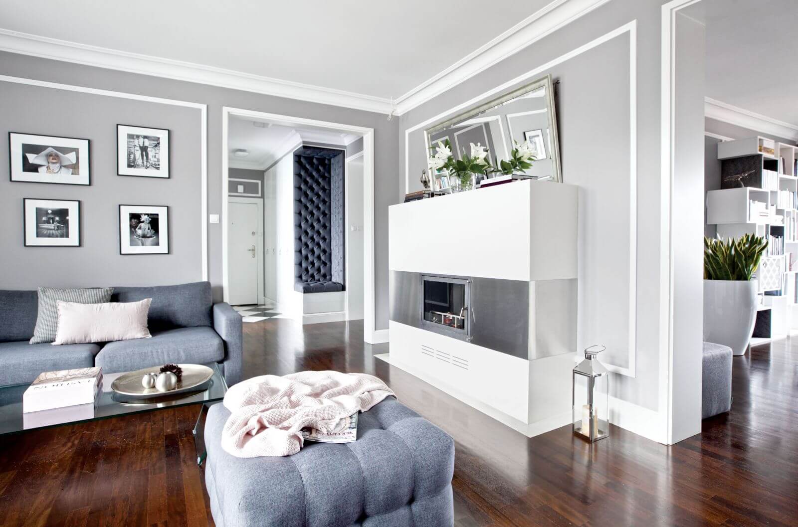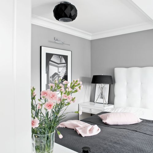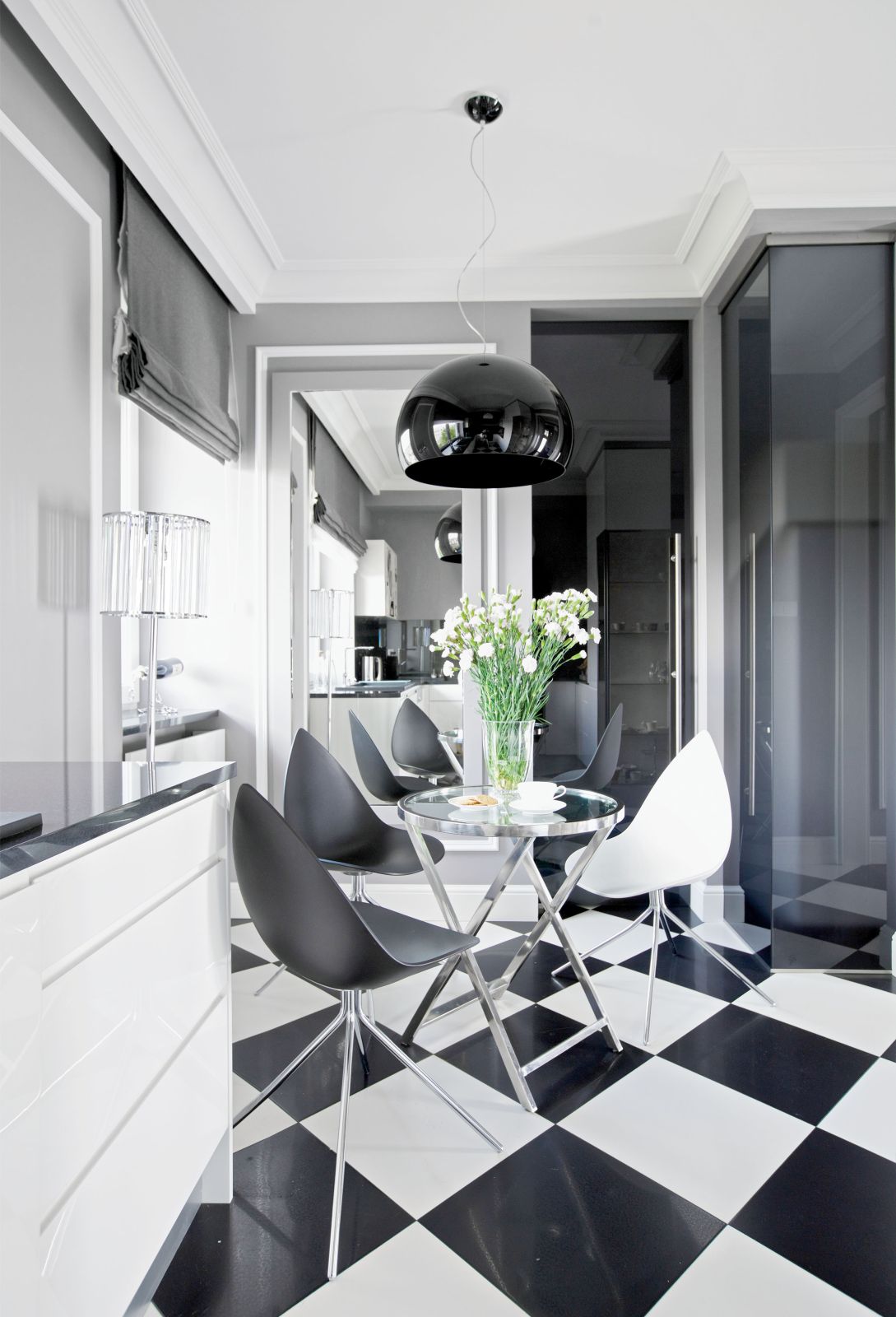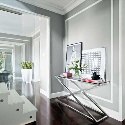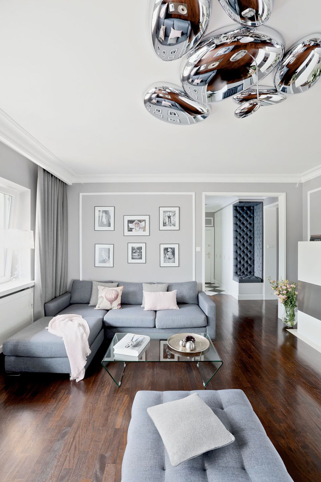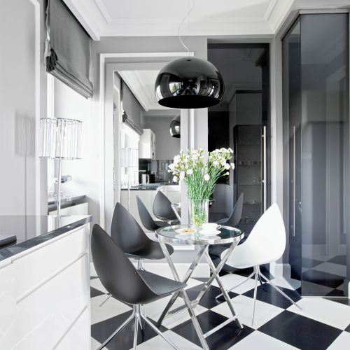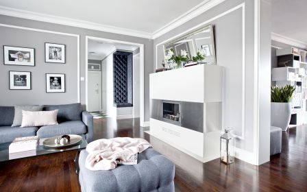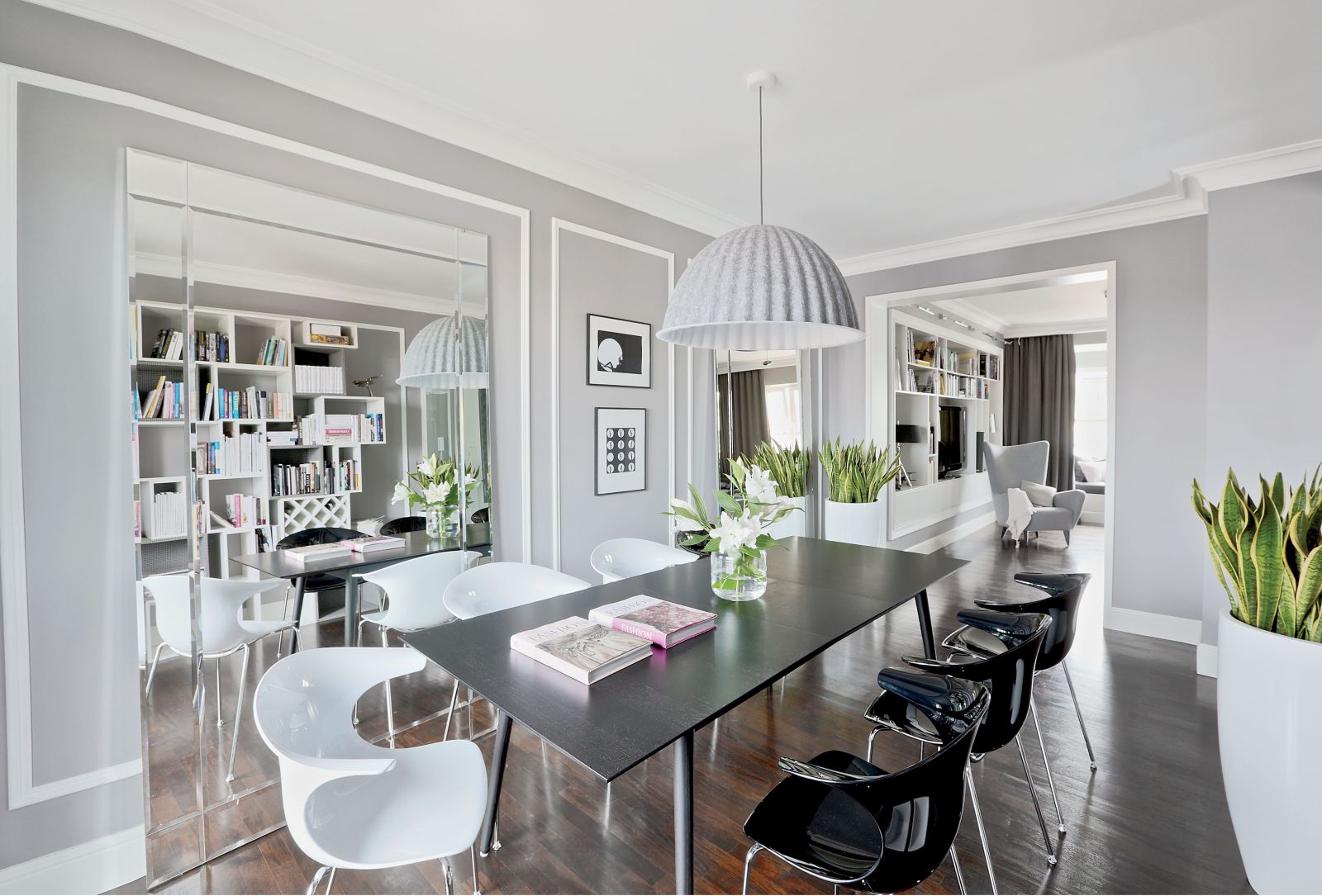 Wspólnym mianownikiem dla tylu pasji i zainteresowań okazała się spokojna klasyka. – Sztukaterie, biele, gołębi kolor – opowiadają architekci. – Genialna jest zwłaszcza szarość, bo z niczym się nie gryzie. Na jej tle świetnie wyglądają i mocne elementy graficzne, i czarno-białe szachownice, i kryształowe lustrzane ściany, i minimalistyczne duńskie przedmioty, wreszcie – włoski dizajn czy luksusowe meble firmy Eichholtz.