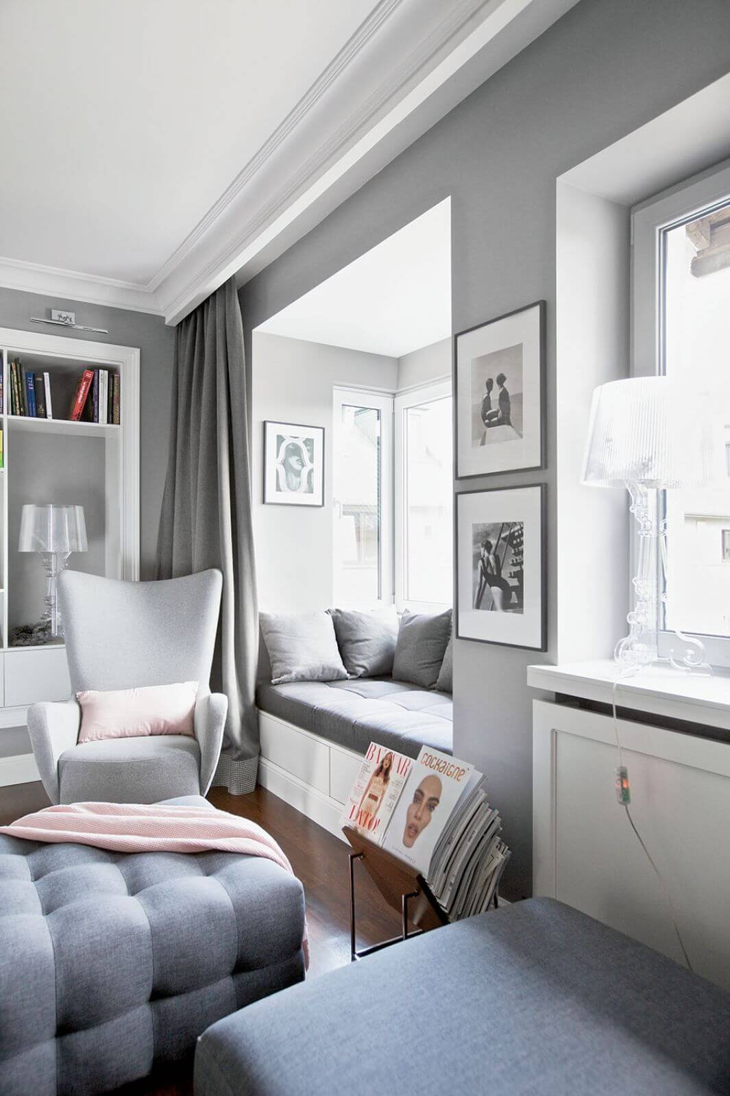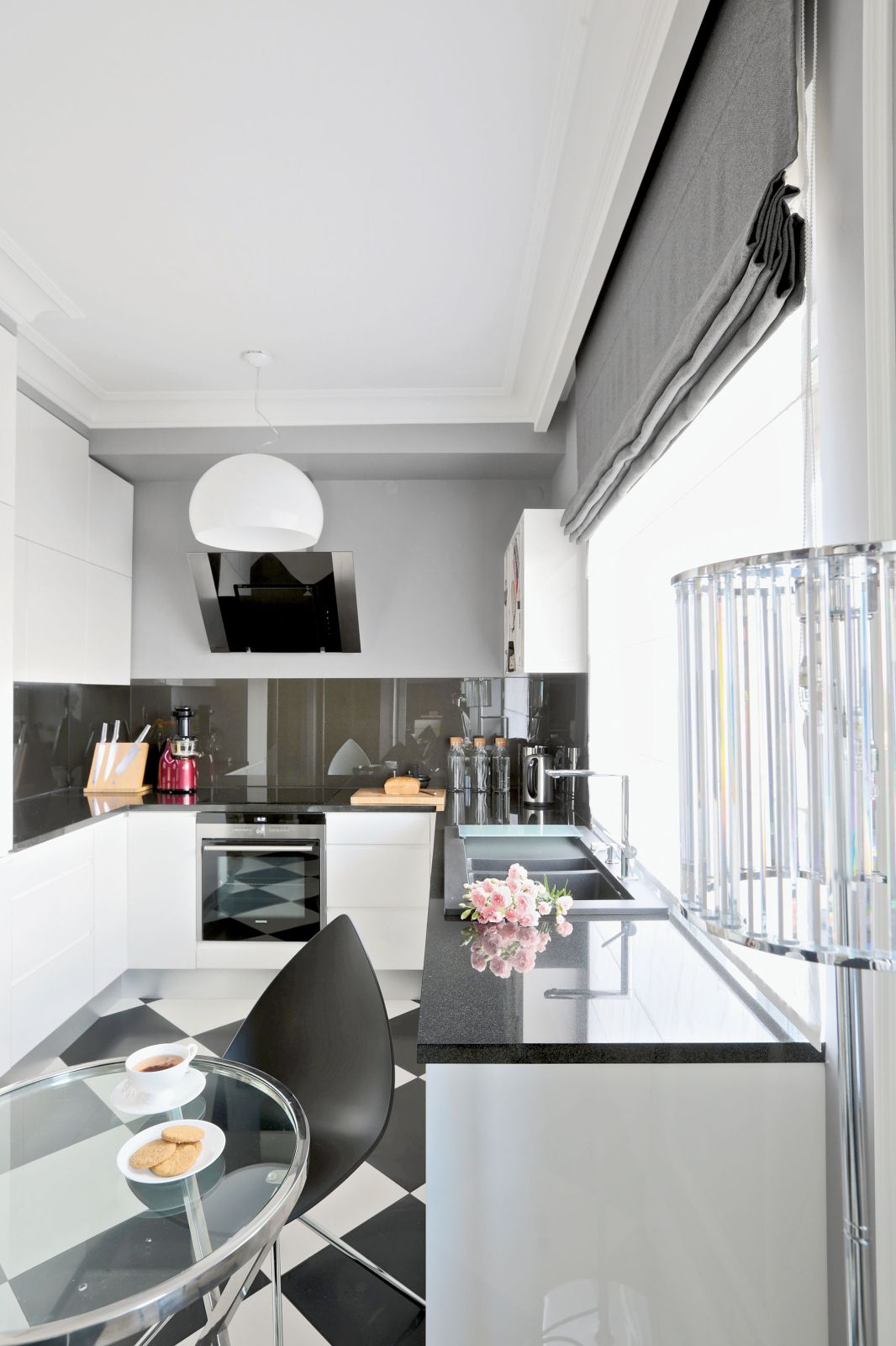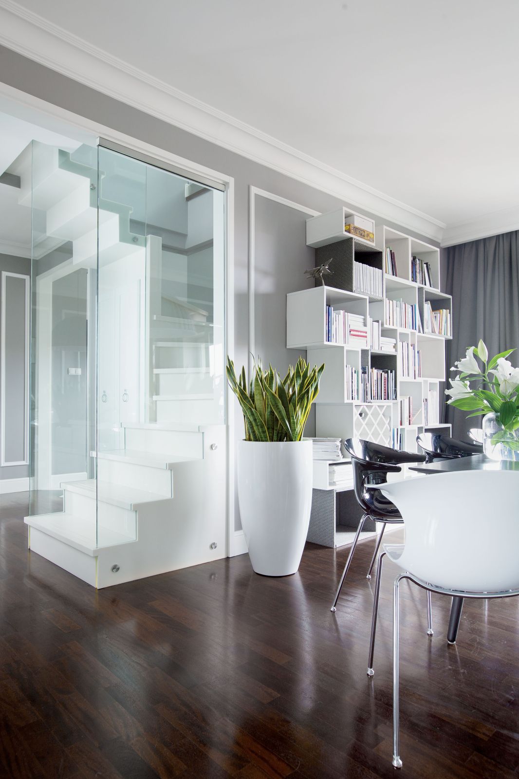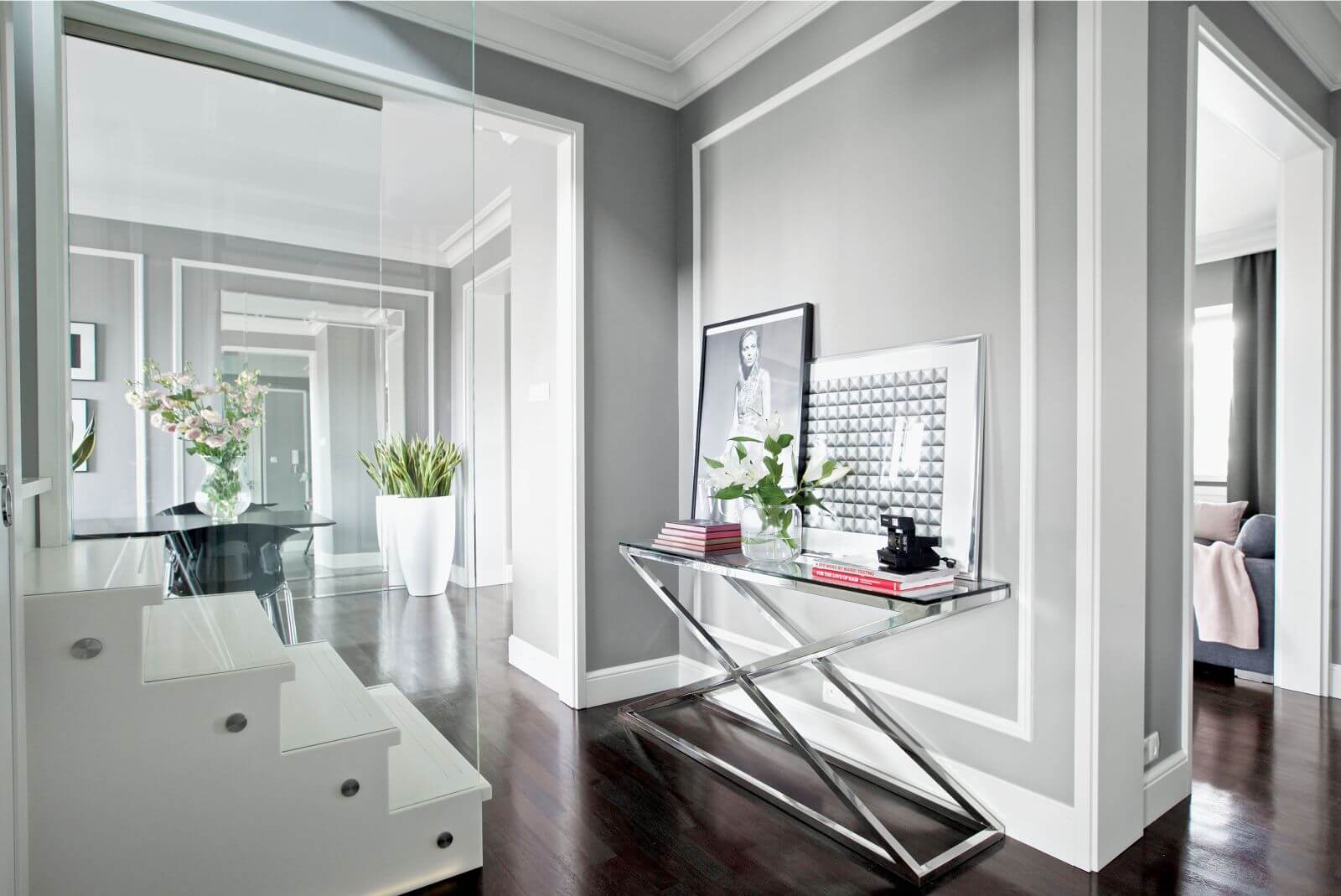 Wspólnym mianownikiem dla tylu pasji i zainteresowań okazała się spokojna klasyka. – Sztukaterie, biele, gołębi kolor – opowiadają architekci. – Genialna jest zwłaszcza szarość, bo z niczym się nie gryzie. Na jej tle świetnie wyglądają i mocne elementy graficzne, i czarno-białe szachownice, i kryształowe lustrzane ściany, i minimalistyczne duńskie przedmioty, wreszcie – włoski dizajn czy luksusowe meble firmy Eichholtz.