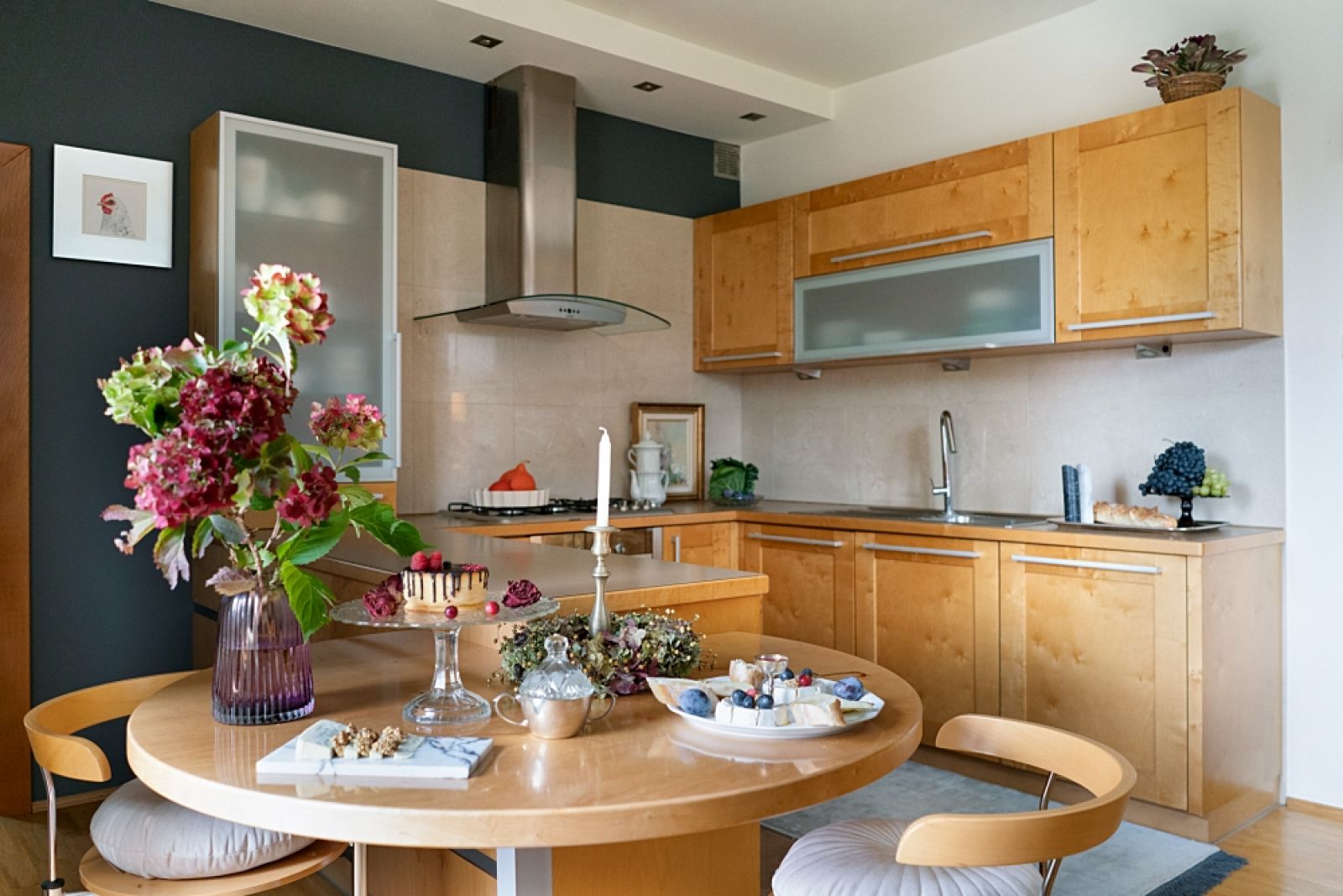 Właścicielom zależało, aby w kuchni było sporo miejsca do przechowywania oraz na dużej ilości blatów, gdyż gospodyni uwielbia gotować (i robi to znakomicie!). Stąd „zawinięcie” blatu na środku kuchni i dołożenie do niego okrągłego stołu. – Kuchnia miała być pojemna i wygodna, z dużą ilością szafek i schowków. To, że nic w niej nie wymieniono przez 20 lat jest moim zdaniem niebywałe! – mówi Małgorzata Bacik. Co więcej znajomość nawiązana pomiędzy właścicielami a projektantami nie tylko przetrwała, ale w trakcie kolejnych projektów zacieśniła się i przerodziła się w prawdziwą przyjaźń.