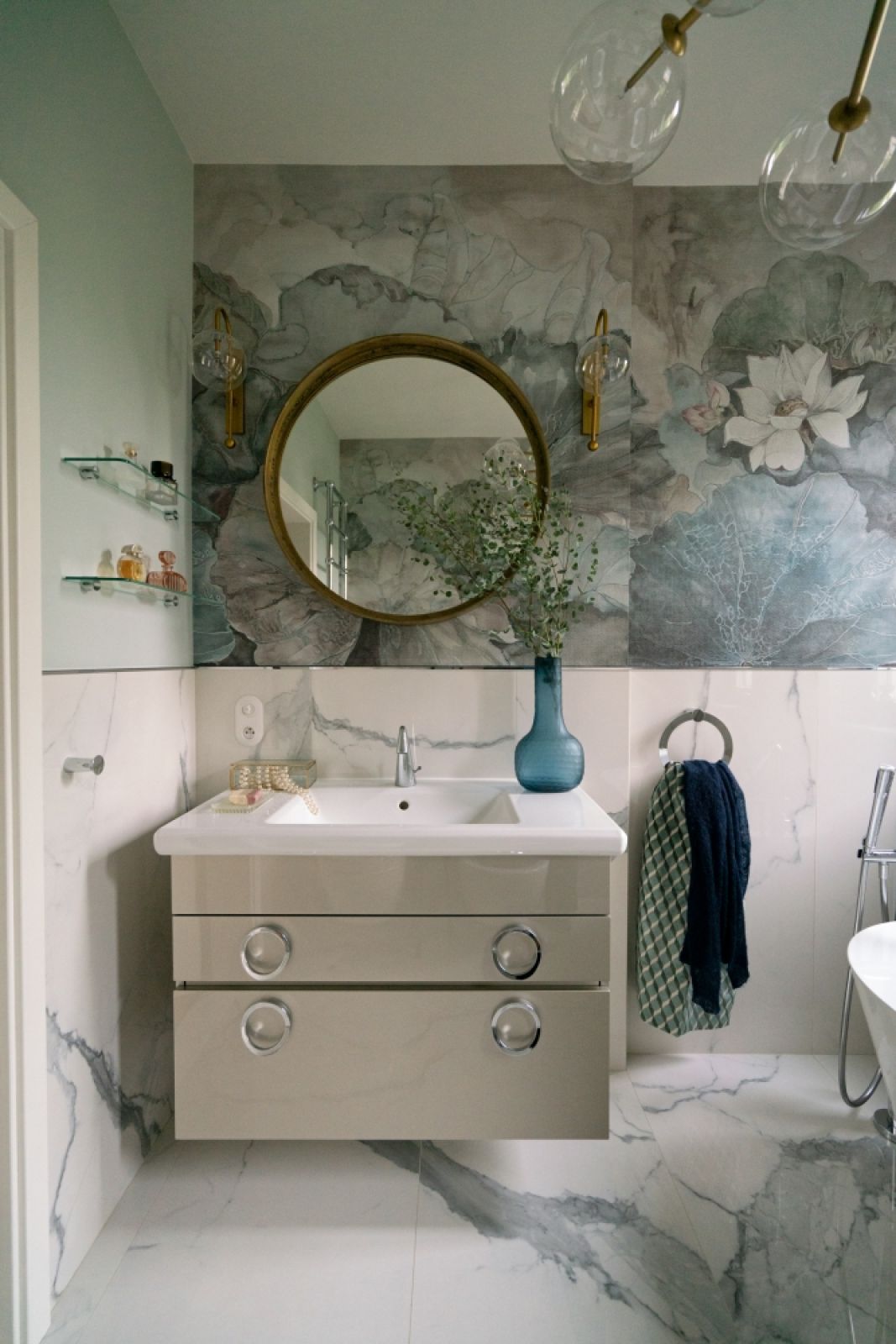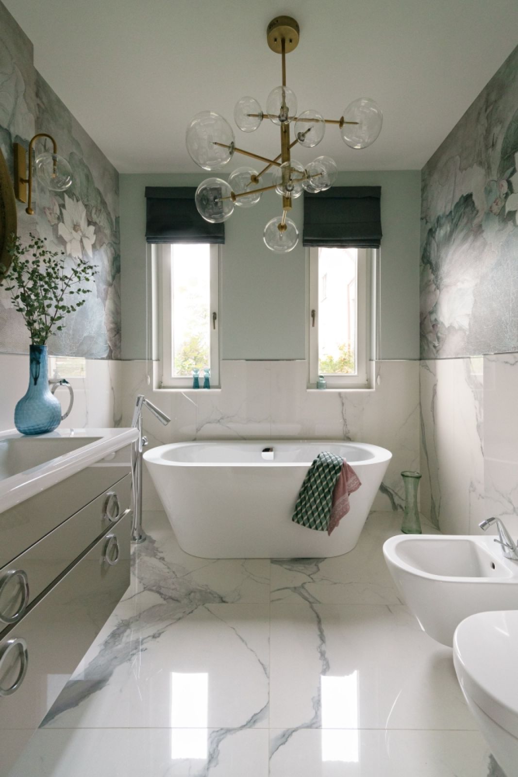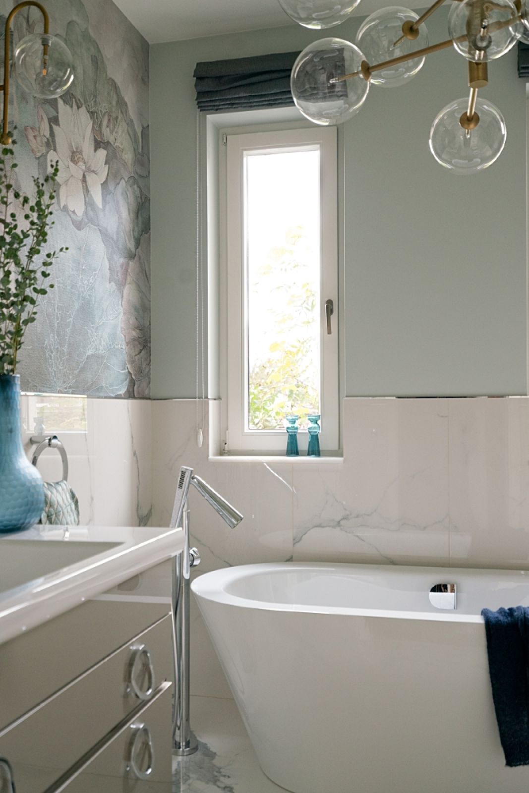 Łazienkę z kolei zaprojektowała 6 lat temu. Powstała lekka, kobieca i elegancka przestrzeń z wygodną wanną wolnostojącą na środku. Pod białym blatem umywalki znalazła się pojemna szafka z szufladami w ciepłym beżowym kolorze, w której zmieściły się wszystkie podręczne akcesoria. Wzrok przyciąga zjawiskowa tapeta z malarskim motywem kwiatów (Wall&Deco), która jest ozdobą łazienki. Wszystko to tworzy wnętrze pełne spokojnych barw, w którym harmonia oraz pozytywna energia idą w parze.